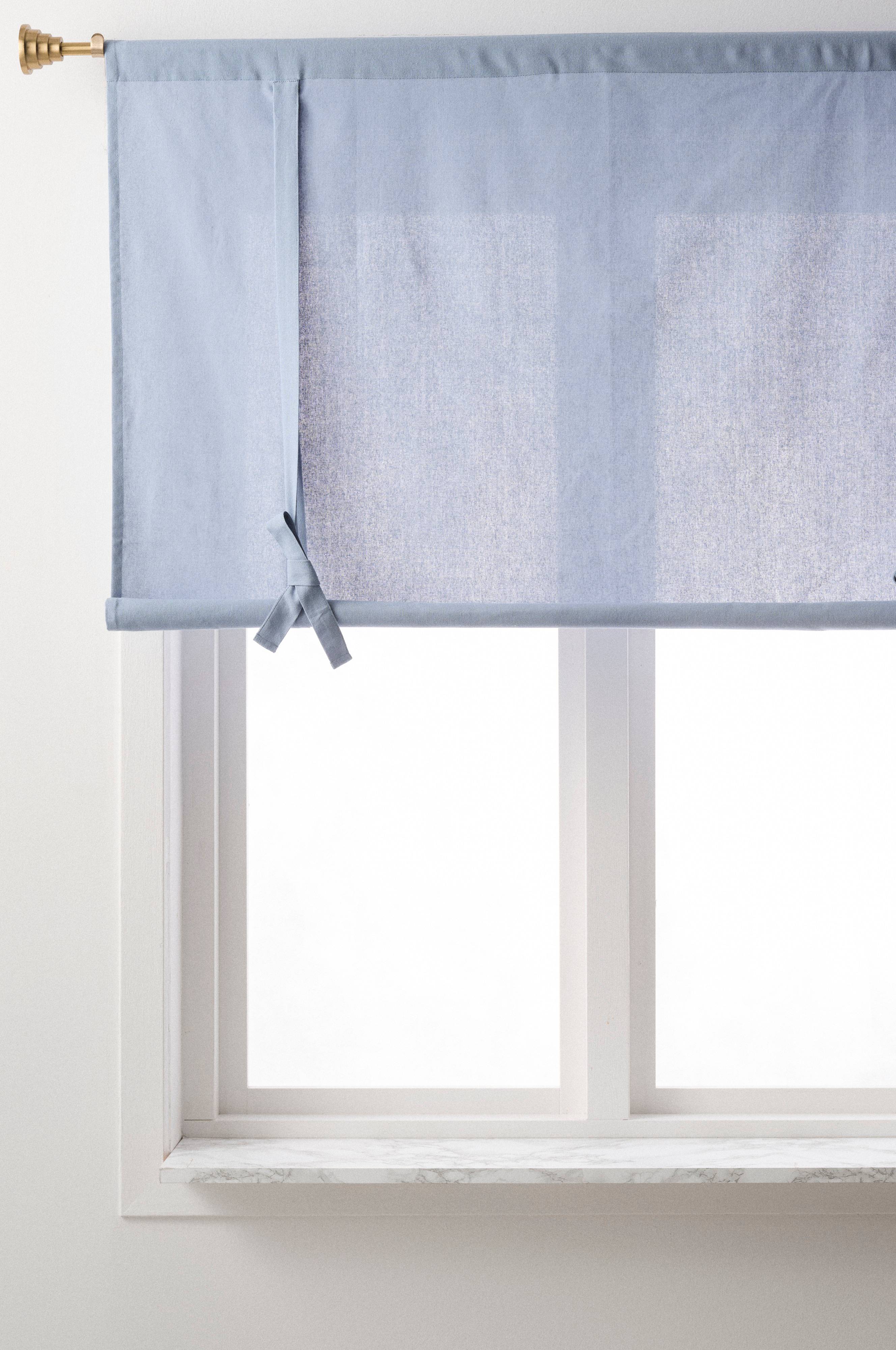 Rullautuva laskosverho puuvillaa. Ripustetaan tavalliseen verhotankoon. Korkeutta säädetään solmimisnauhoilla.