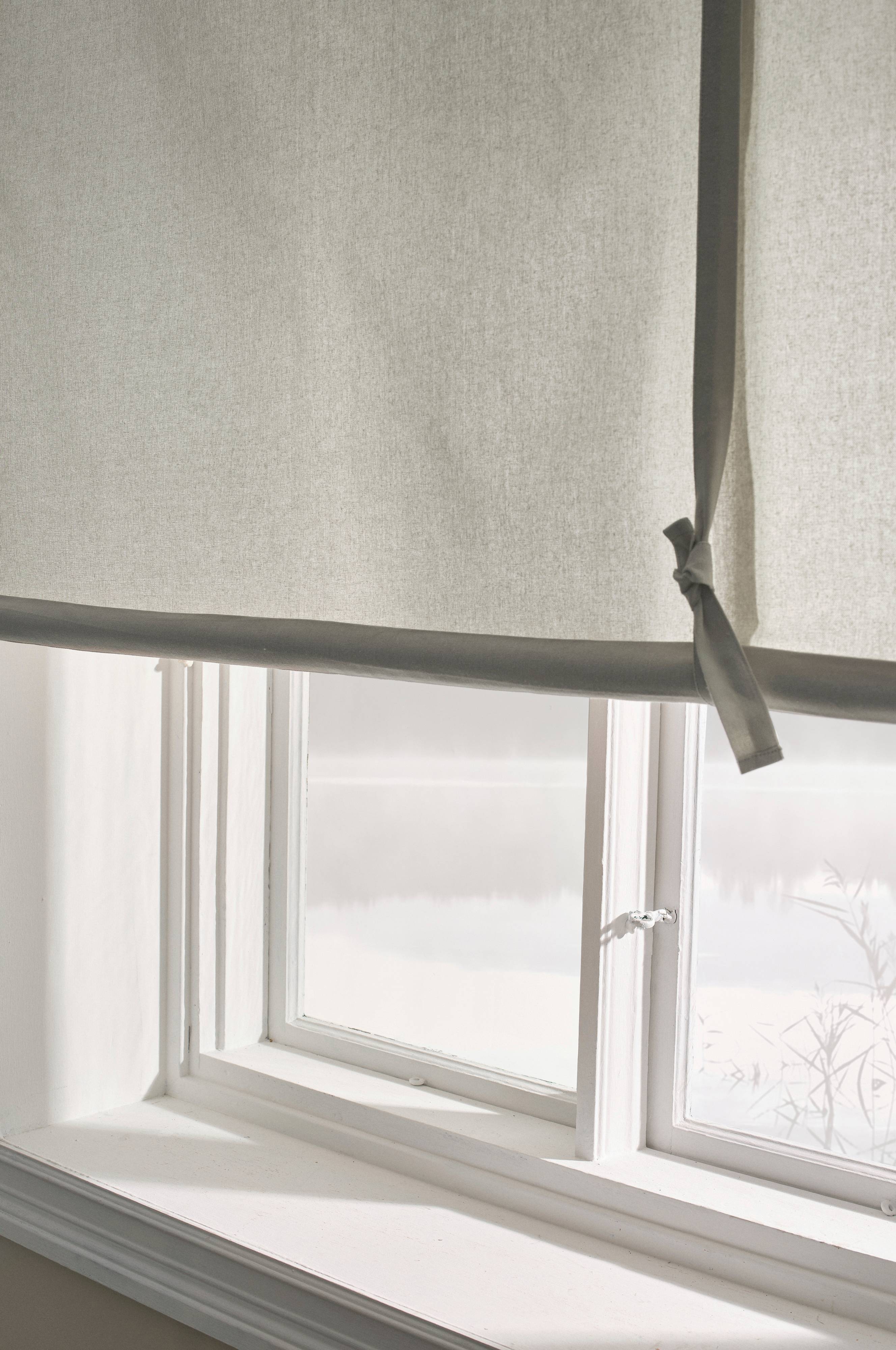 Rullautuva laskosverho puuvillaa. Ripustetaan tavalliseen verhotankoon. Korkeutta säädetään solmimisnauhoilla.
