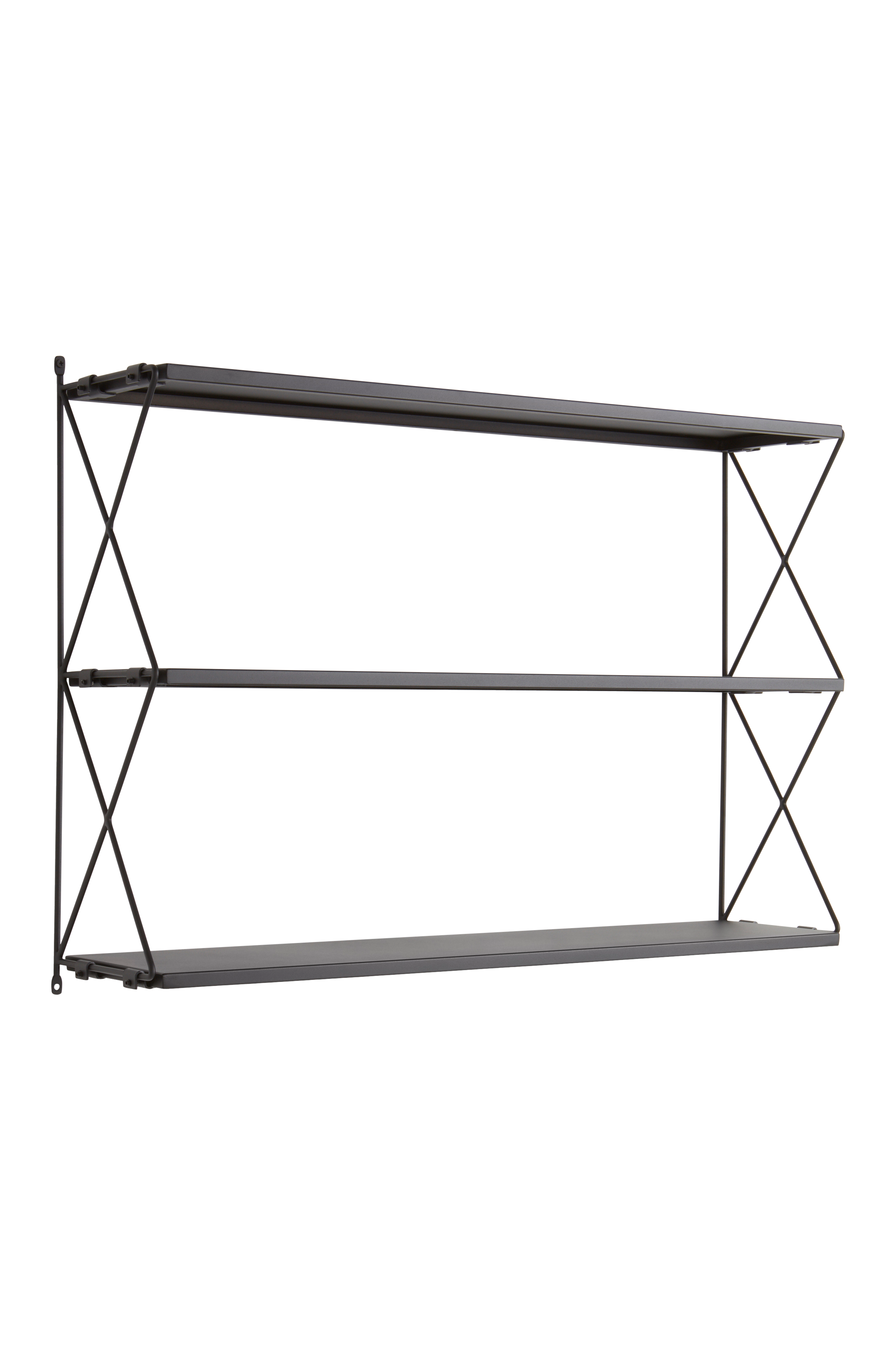 Tämä hyllykkö koostuu kahdesta sivuristikosta ja kolmesta hyllytasosta, jotka ovat melamiinilla pinnoitettua MDF-levyä. Hyllyissä on lyhyillä sivuilla metallikiinnikkeet, joiden ansiosta ne riippuvat vakaasti sivuristikoissa. Hyllyjä on helppo siirtää. Osittain koottava. Kokoamisohje mukana.