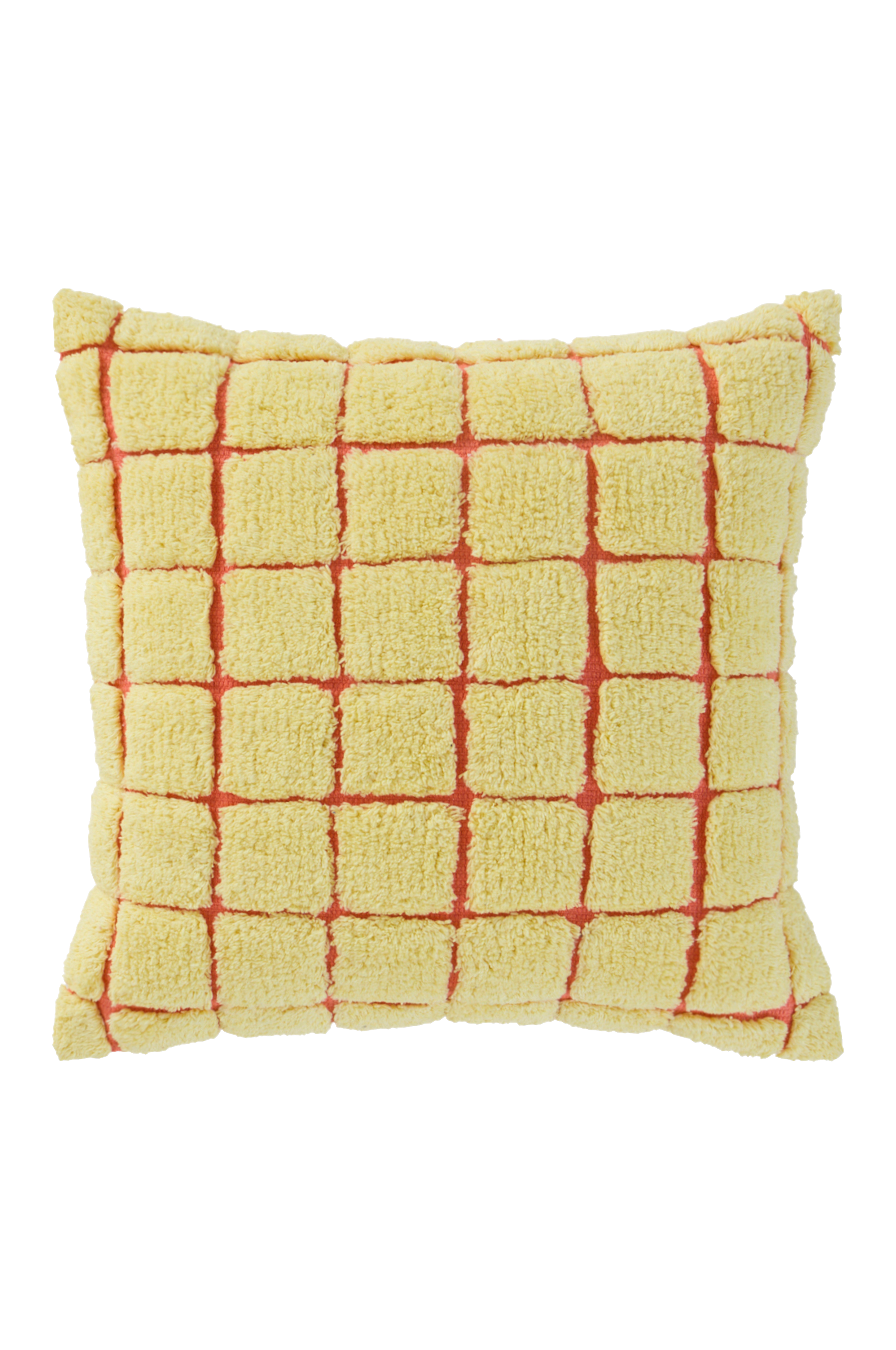 Tyynynpäällinen paksuhkoa kangasta, jossa tuftattuja neliöitä. 1/pakkaus. Pehmeä, lyhyt nukka luo hienon vaikutelman. Taustapuoli on yksiväristä kangasta. Piilovetoketju takana. Kankaan paino 440 g/m².