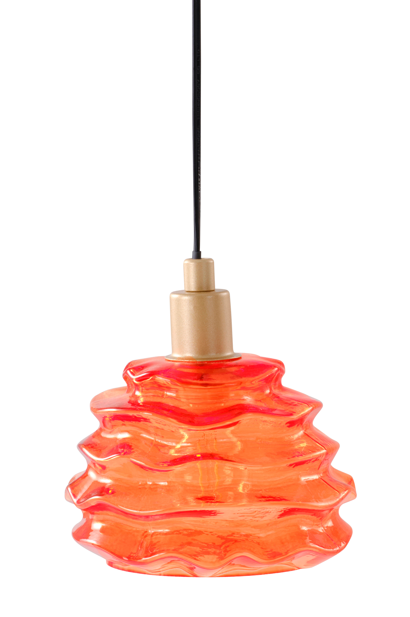 Kirkkaasta lasista valmistettu ikkunavalaisin, jossa kullanvärinen metallikiinnike ja musta johto, jossa seinäpistoke ja virtakatkaisin. Hieno kupu on muodoltaan aaltomainen ja epäsäännöllinen, ja valonlähde näkyy kuvun läpi. Litteä Eurooppa-mallinen seinäpistoke, jossa on ohuehkot piikit (4 mm).