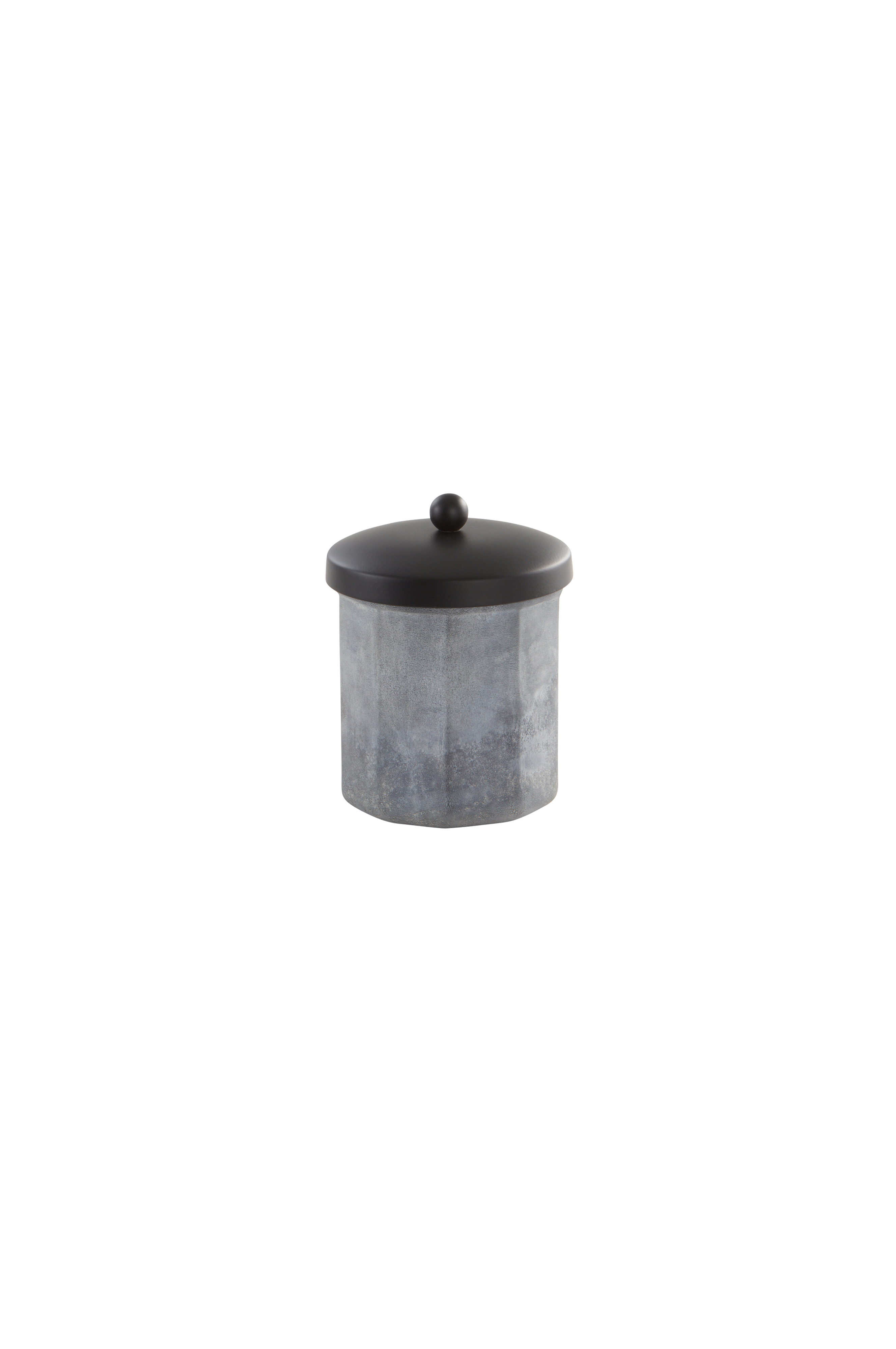 Purkki ja kansi, purkki on lasia ja kansi on messinkiä, jossa mattamusta pinta. Purkki on kymmenkulmainen ja lasi näyttää huurretulta. Kaunis pieni purkki sopii hyvin kylpyhuoneeseen. Purkissa voi säilyttää vaikkapa vanupuikkoja, koruja tai mitä vain muita pieniä tarvikkeita.
