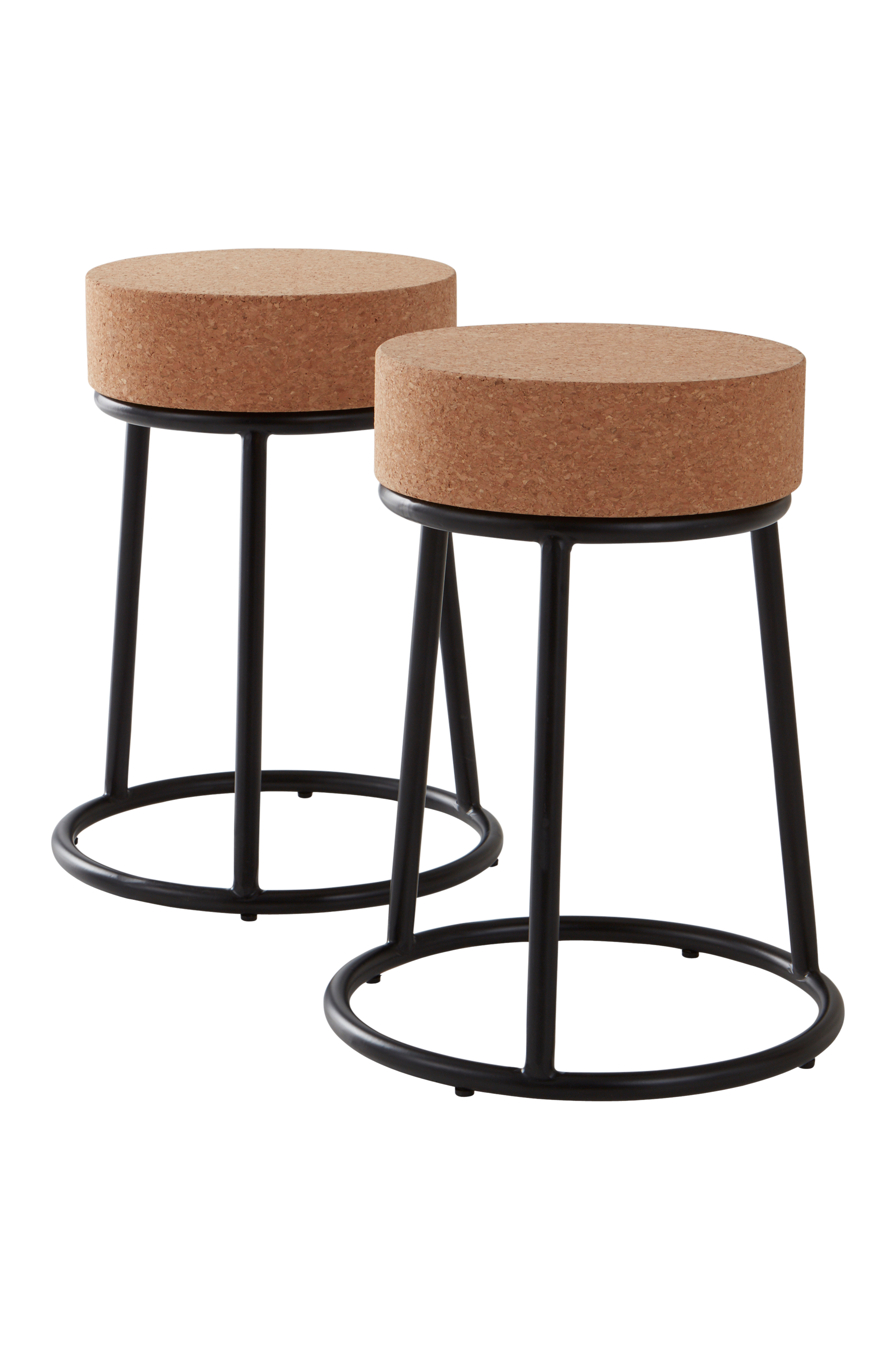 Tyylikkäät ja erityisen malliset jakkarat, 2/pakkaus. Jakkaroiden istuin on korkkia ja tukeva ja tyylikäs jalusta jauhemaalattua terästä. Osittain koottava. Kokoamisohje mukana.