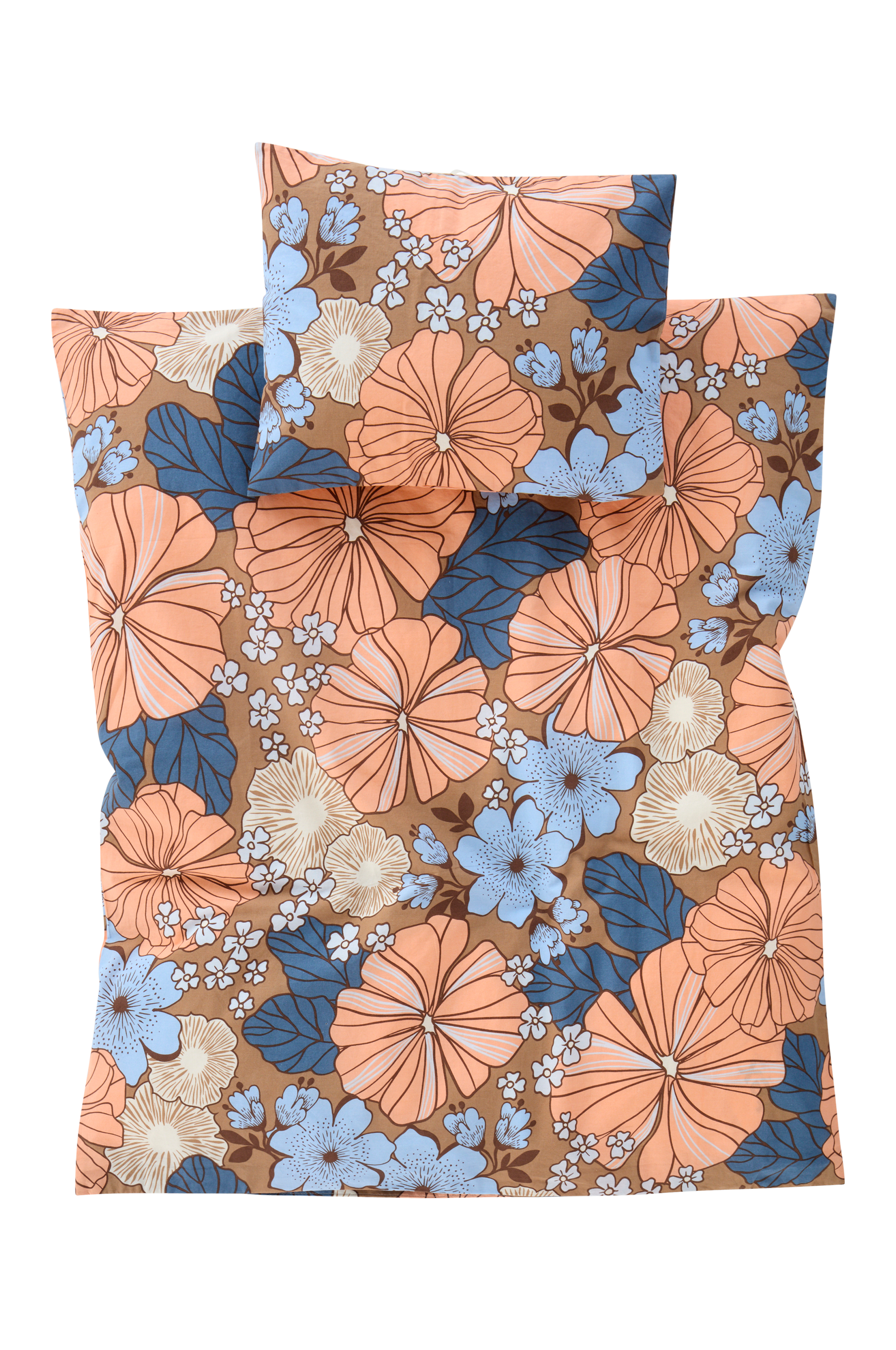 Kaksiosainen pussilakanasetti, jossa on pussilakana ja tyynyliina, hienokudottua, tiukasti kudottua puuvillaa. Kankaassa on kaunis kukkakuvio, joka on painettu kauniilla värivalikoimalla. Se on myös entsyymipesty, mikä antaa sille miellyttävän pehmeyden ja hieman kuluneen tuntuman. Setti sopii lastenvaunuihin ja -rattaisiin.
