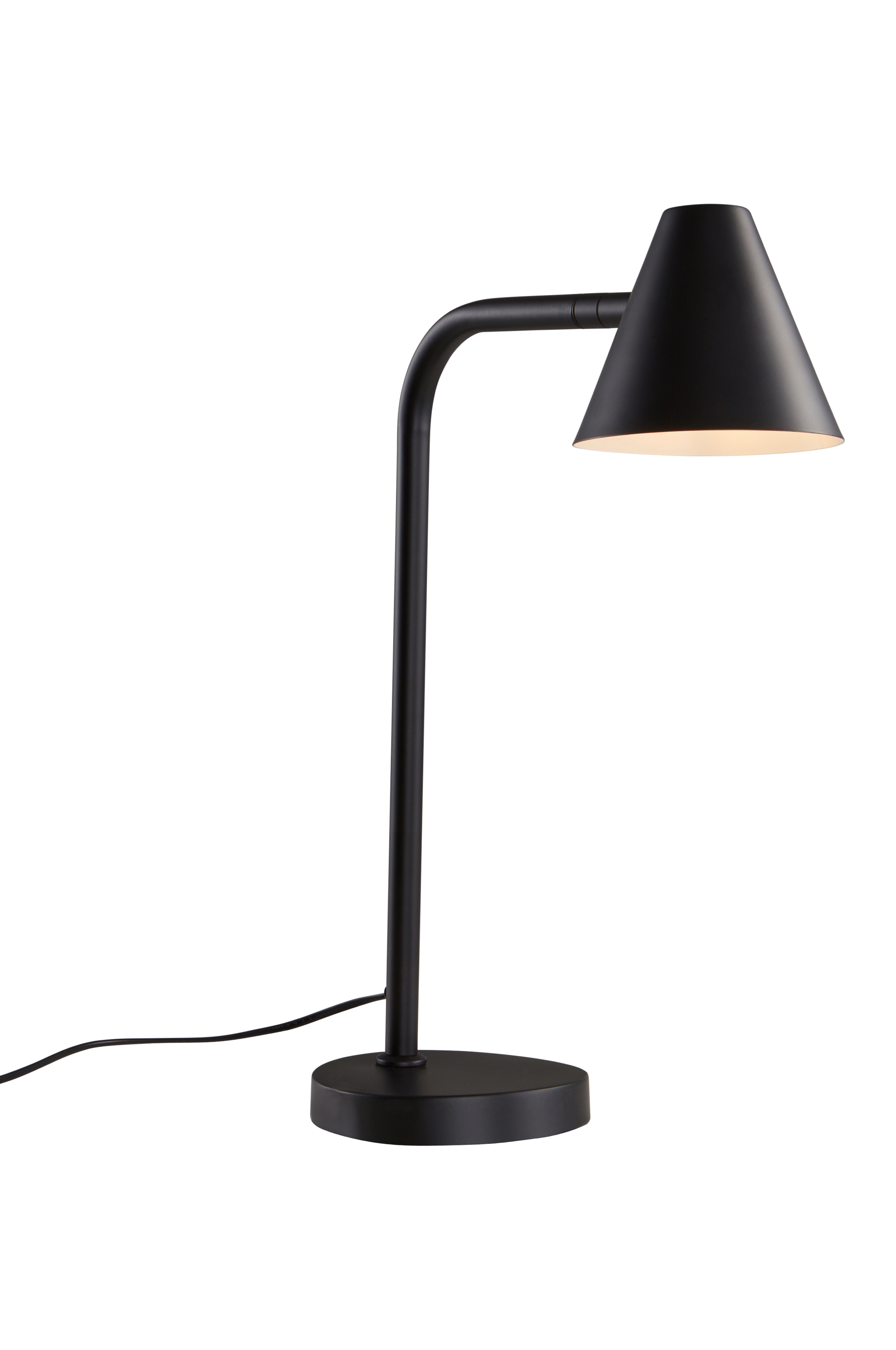 Pöytävalaisin mattapintaista metallia. Lampunvarjostimen vaalea sisäpinta antaa hyvän valon, jos haluat käyttää valaisinta kirjoituspöydällä tai lukulamppuna. Varjostinta voi kääntää 360 astetta, minkä ansiosta voit suunnata valon sinne minne haluat. Musta muovijohto, jossa virtakatkaisin.