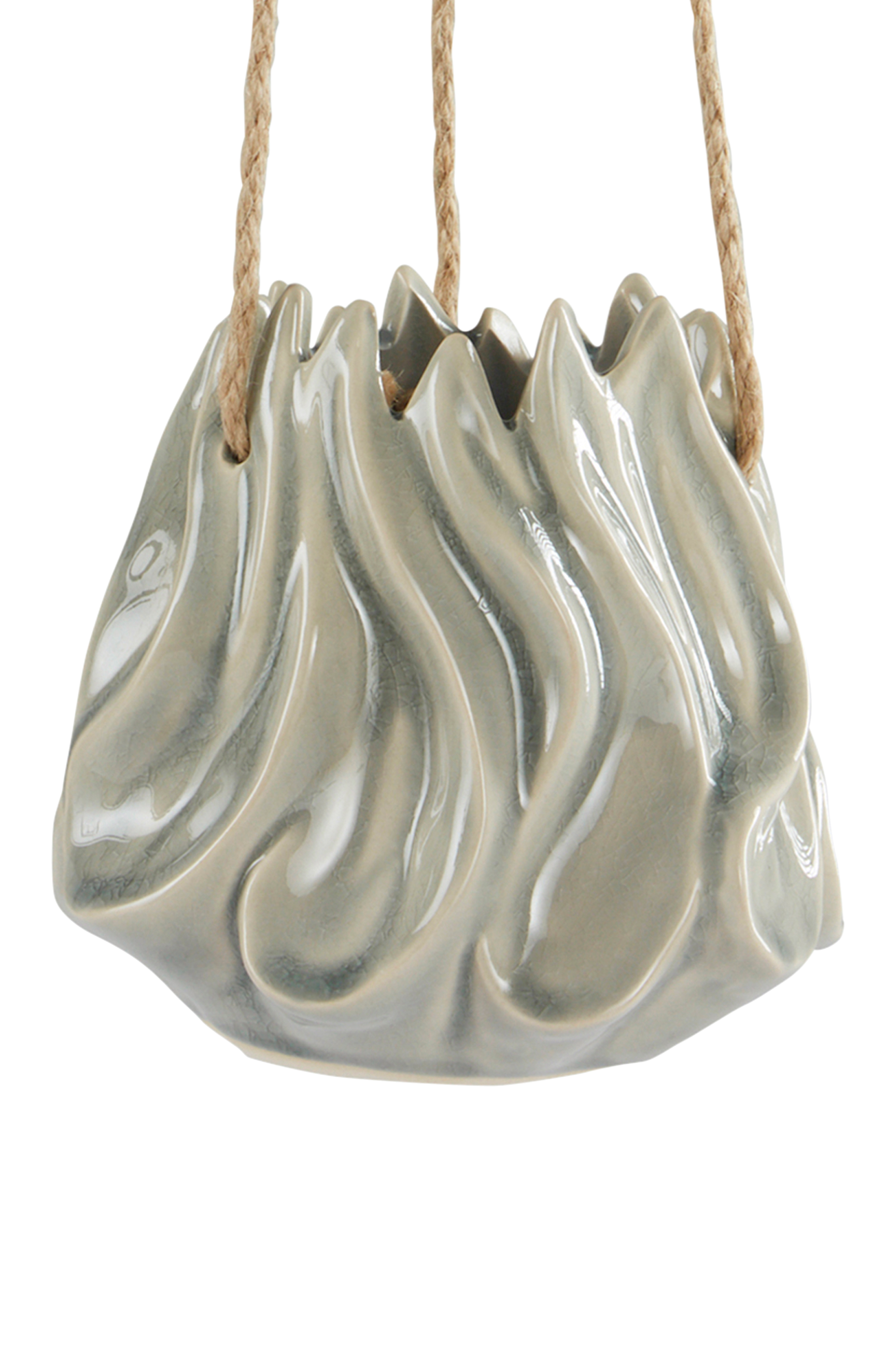 Riippuva keramiikkaruukku ja hamppunaru. Ruukun epäsäännöllinen muoto muistuttaa meren koralleja. Ulkopinnassa kiiltävä, neutraalin värinen lasitus. Lasitettu sisäpinta. Keramiikka voi päästää kosteutta läpi.