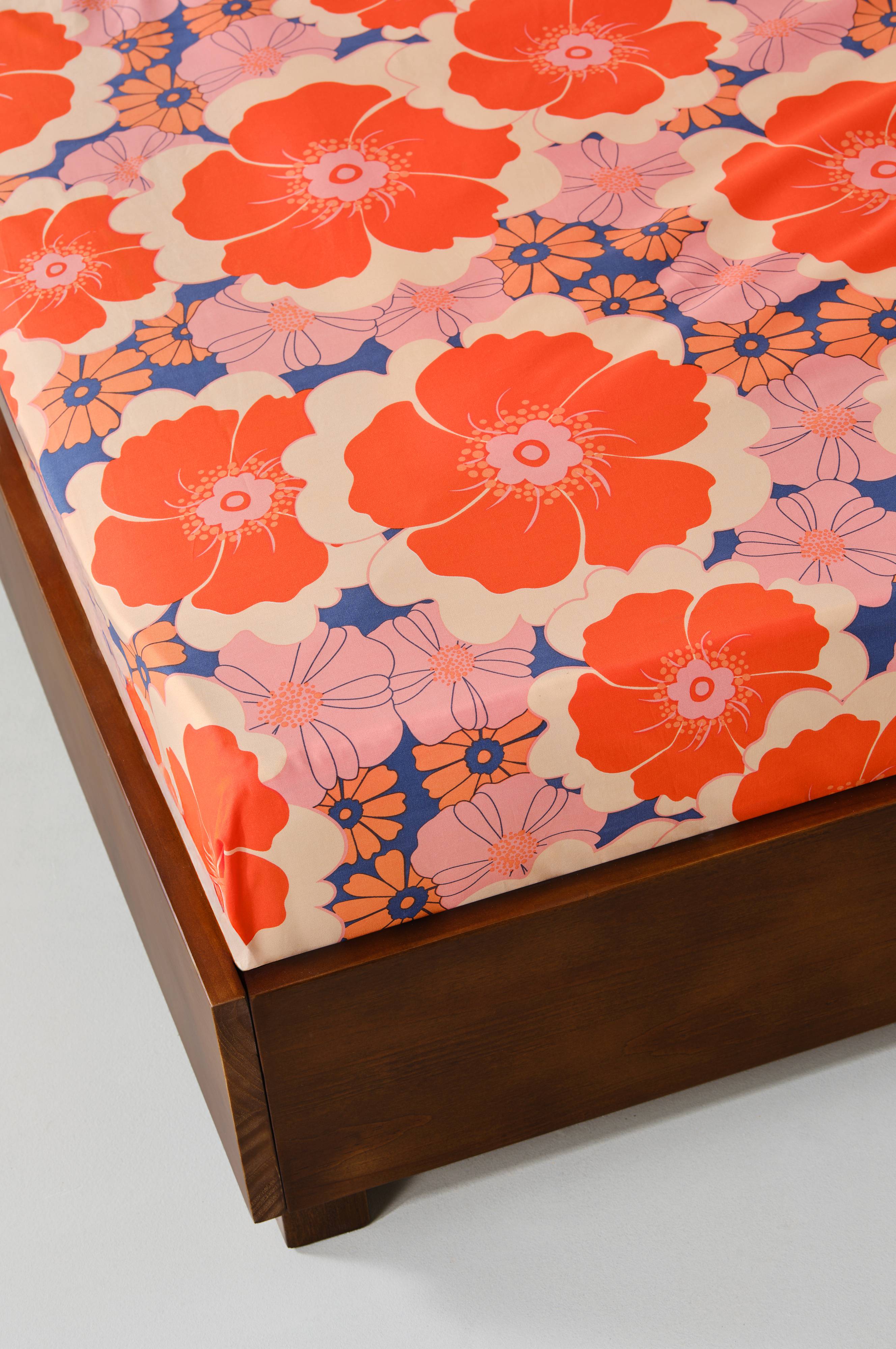 MARIA CARLBERGin suunnittelemassa FRIDA-lakanassa on retropainatus. Se on osa FRIDA-mallistoa, jonka avulla voit helposti sovittaa yhteen muiden kappaleiden kanssa yhtenäisen ja eloisan sisustusteeman luomiseksi.