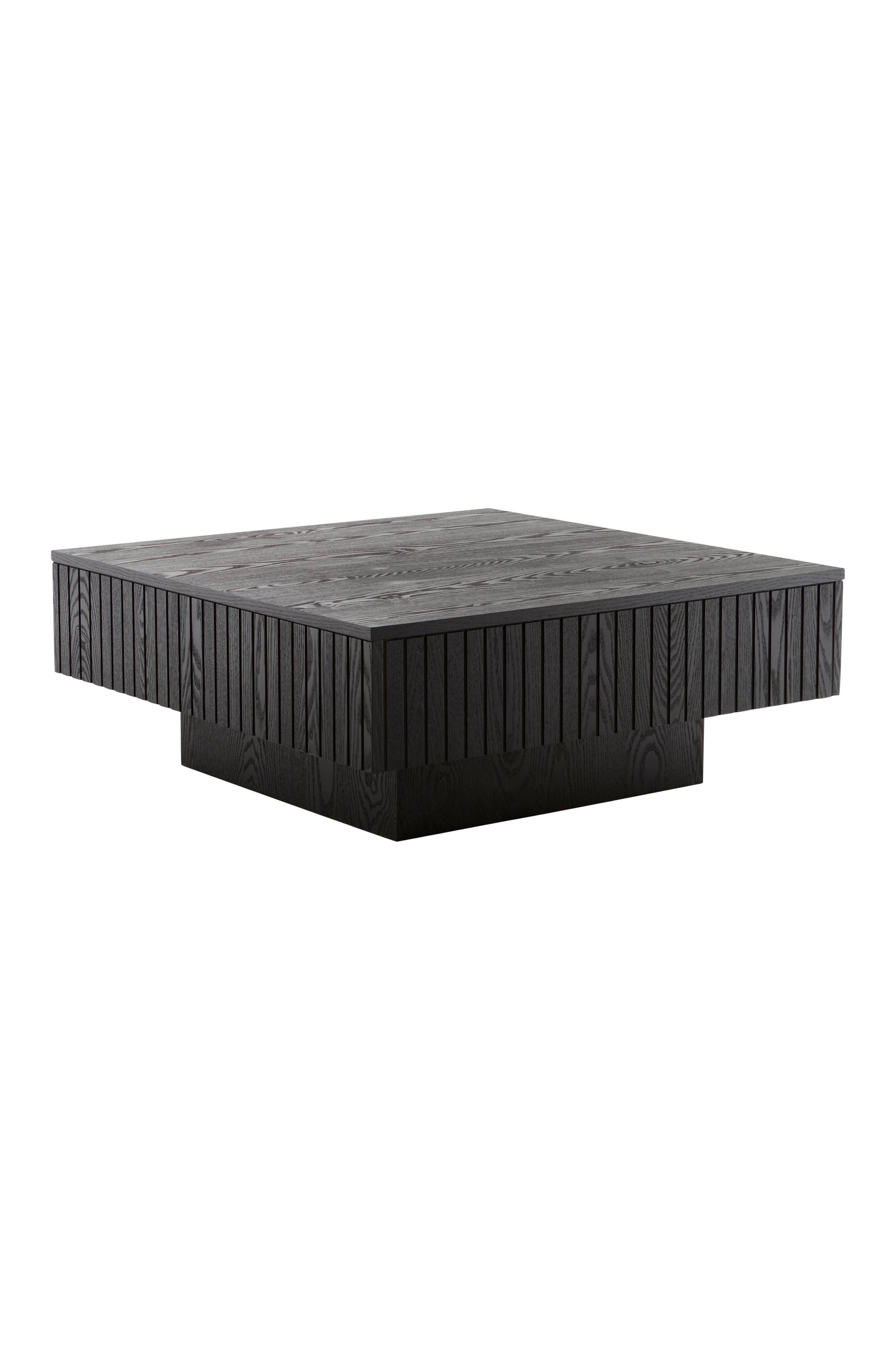 Tämä neliönmuotoinen sohvapöytä on valmistettu MDF-levystä, jossa on matta, pehmeä lakkapinta. Siinä on pystysuorat jyrsityt raidat sivuilla, huomattava pöytälevyn korkeus ja raskas keskijalka. Raidoitus korostaa muotoilua.