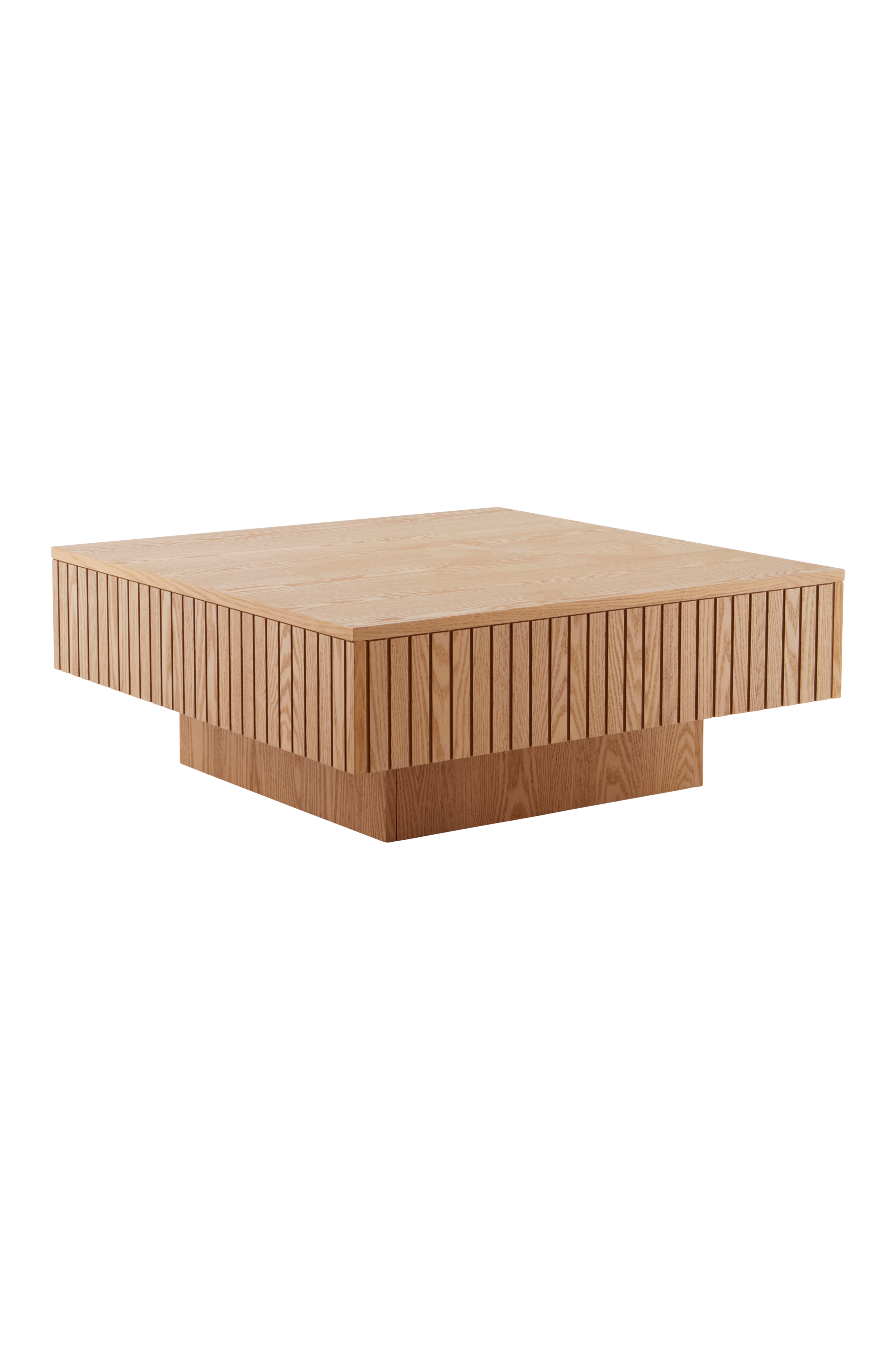 Tämä neliönmuotoinen sohvapöytä on valmistettu MDF-levystä, jossa on matta, pehmeä lakkapinta. Siinä on pystysuorat jyrsityt raidat sivuilla, huomattava pöytälevyn korkeus ja raskas keskijalka. Raidoitus korostaa muotoilua.