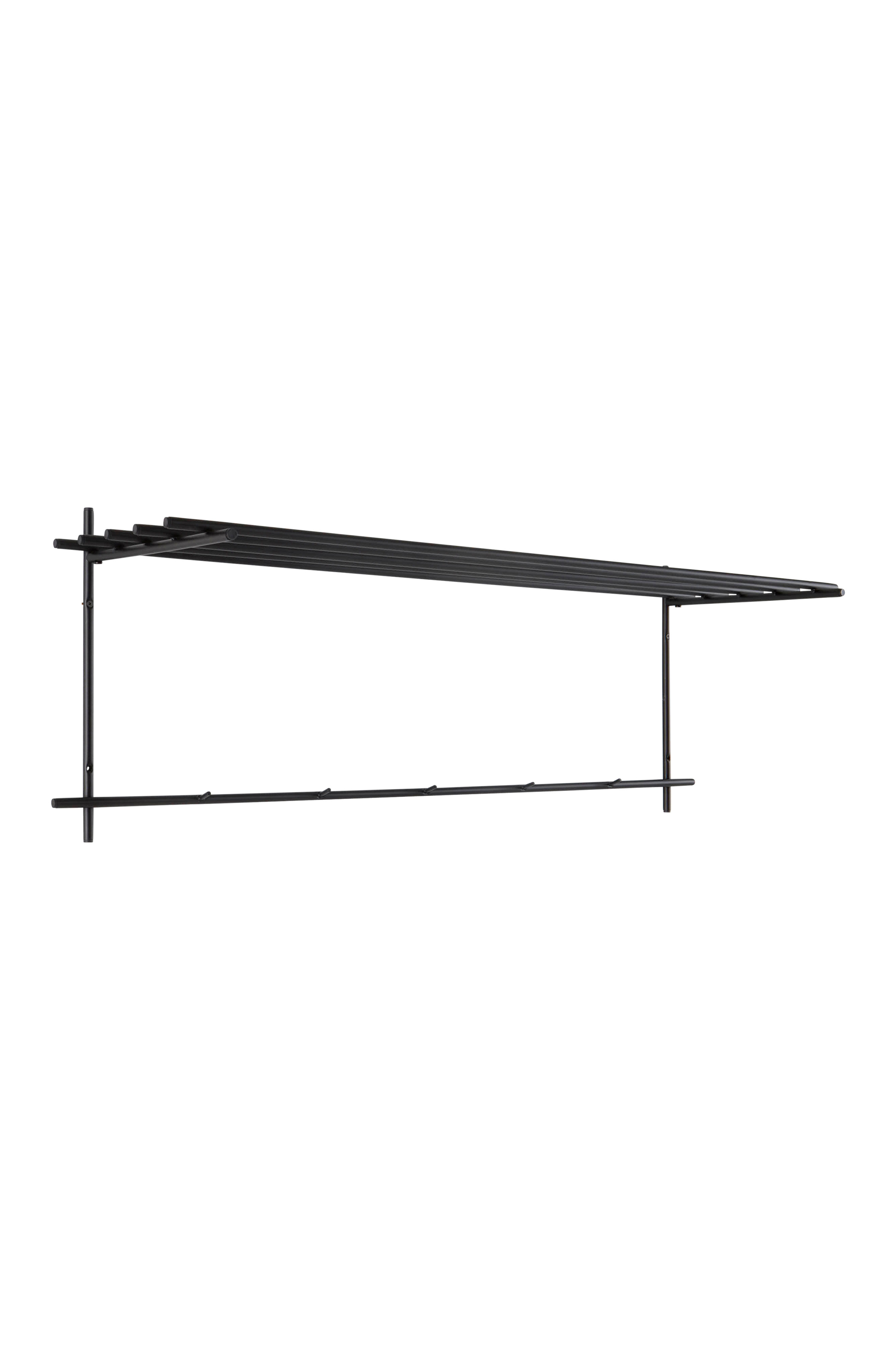GLAZE on minimalistinen eteissarja tyylikästä säilytystä varten. Hattuhylly on rautaputkea, jossa on musta jauhemaalattu pinta. Hattuhyllyssä on viisi nuppia vaatteiden ripustamista varten, yksi hylly ja etummaisessa tangossa tilaa vaateripustimille. Tilaa vaateripustimet erikseen.