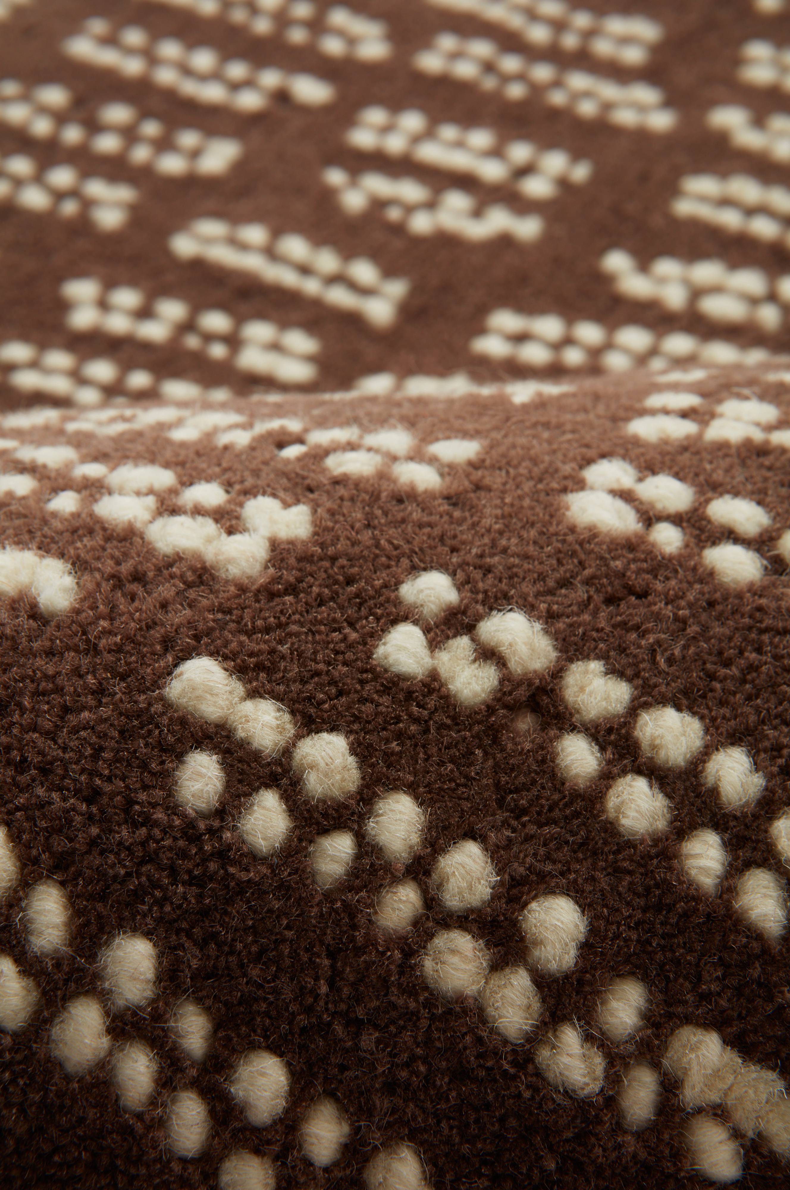 Käsin tuftattu villamatto, jonka näyttävä kuvio on luotu erilaisin kudontatekniikoin ja erivärisin langoin. Tumma perusväri on lyhyttä ja tiivistä leikattua nukkaa ja vaaleat koristeraidat kuvion muodostavaa silmukkanukkaa. Villa tekee matosta luonnollisen lämpimän ja käytännöllisesti likaa hylkivän. Nukan pituus 1-1,1 cm. Paksuus 1,2-1,4 cm. 3800-4000 g/m².