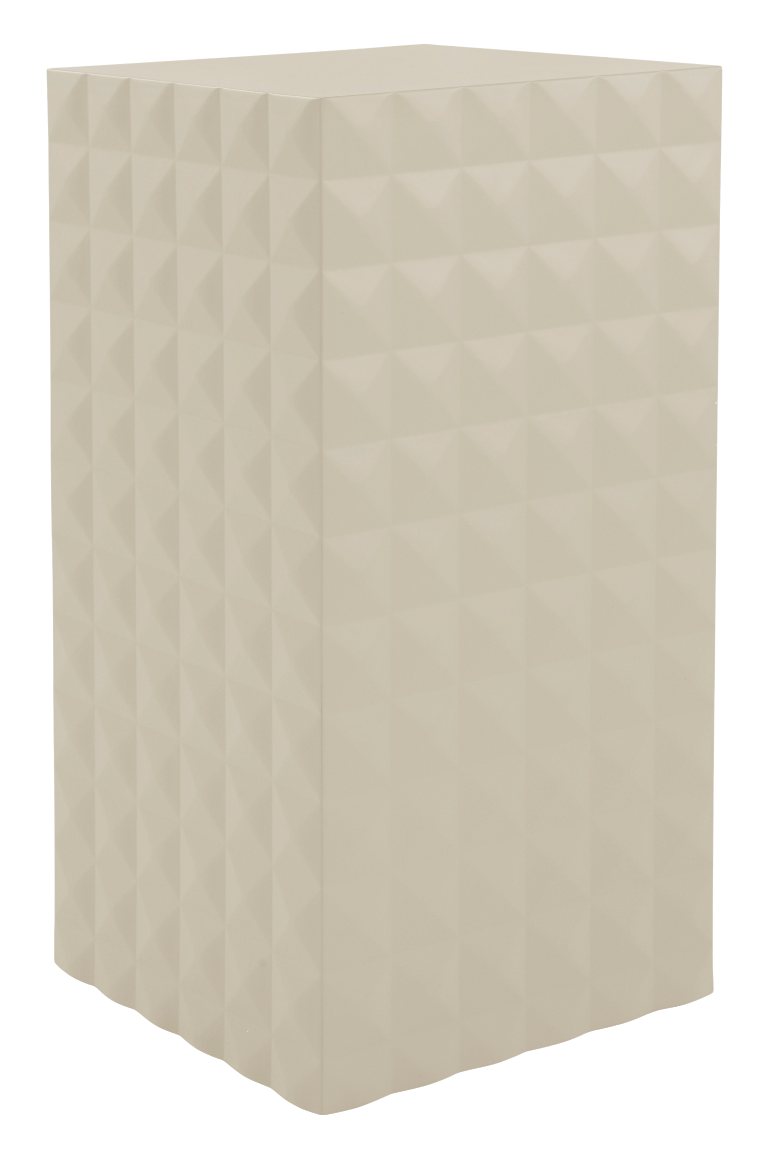 Neliönmuotoinen sivupöytä FSC-merkittyä, mattapintaiseksi maalattua MDF-levyä. Sileä pöytälevy ja sivuilla näyttävä geometrinen 3D-kuvio. Korkeahko pöytä sopii hyvin viherkasvin tai tyylikkään koriste-esineen jalustaksi.