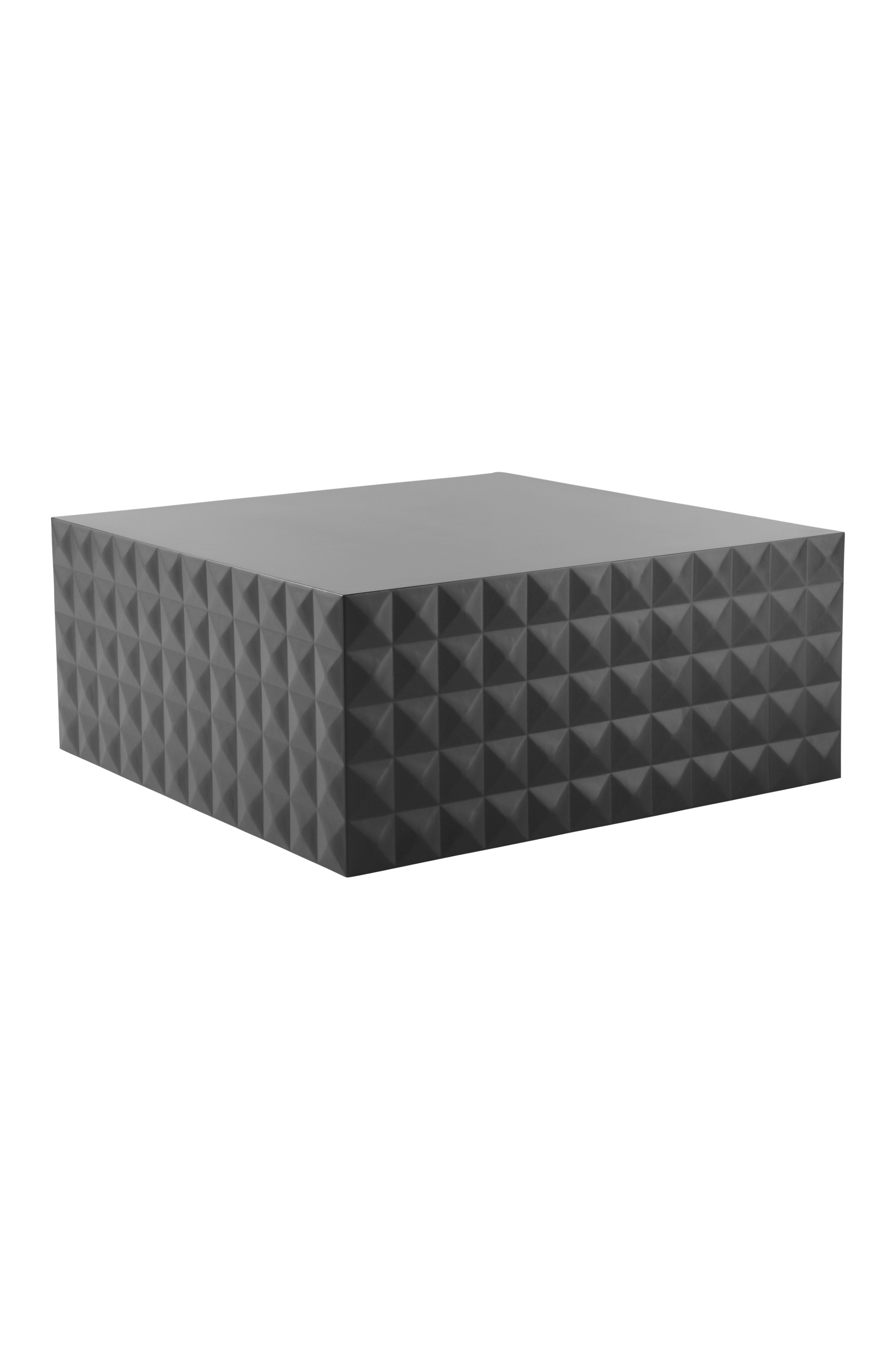 Neliönmuotoinen sohvapöytä FSC-merkittyä, mattapintaiseksi maalattua MDF-levyä. Sileä pöytälevy ja sivuilla näyttävä geometrinen 3D-kuvio.
