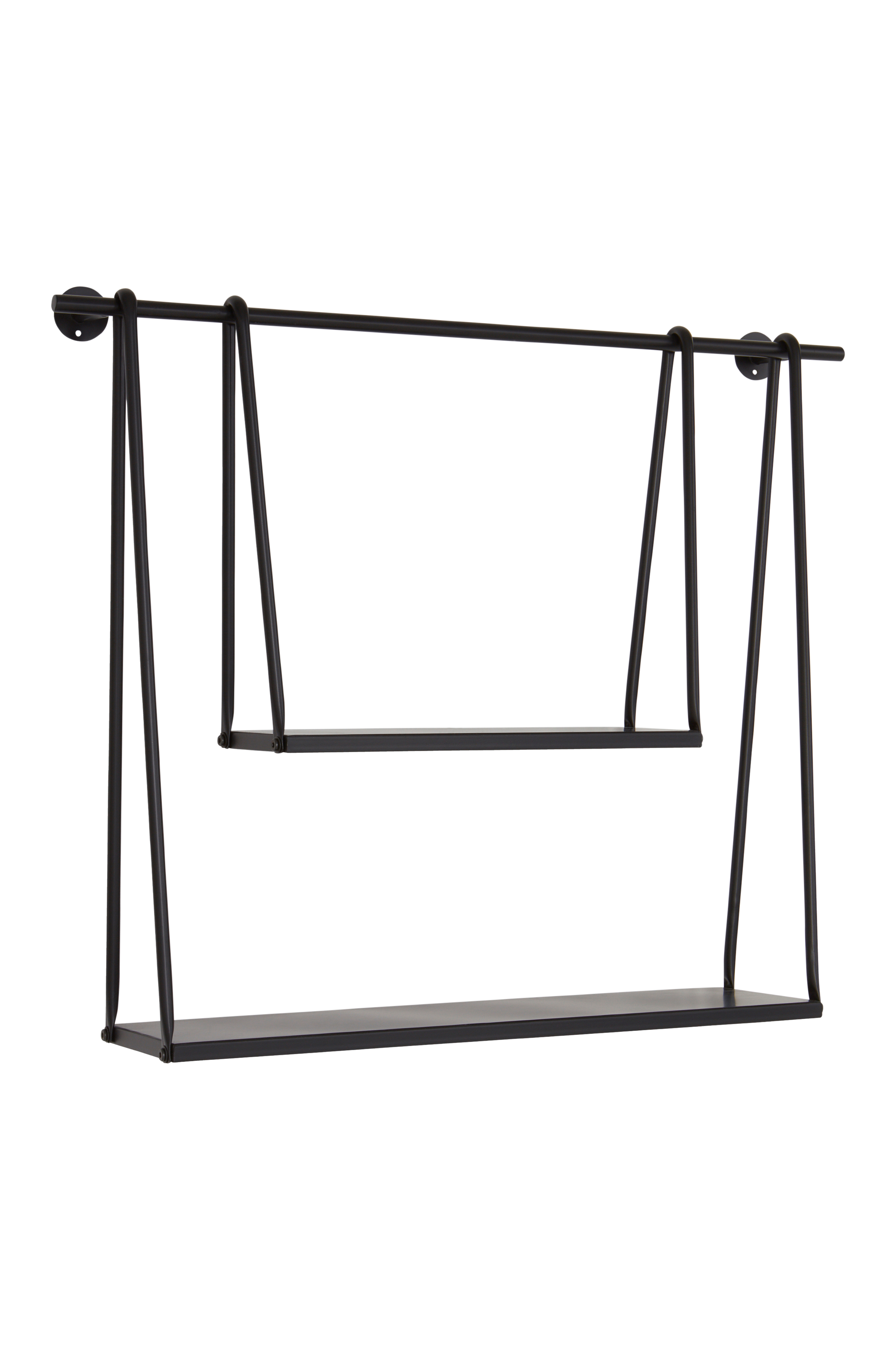 Seinähylly rautaa, hyllyssä jännittävä design. Kaksi hyllyä roikkuu tangossa, joka kiinnitetään seinään. Pienempi hylly on kapeampi eikä niin syvä. Seinähylly on sekä kätevä ja kaunis, ja sopii täydellisesti esimerkiksi eteiseen. Hylly on maalattu öljypohjaisella maalilla.