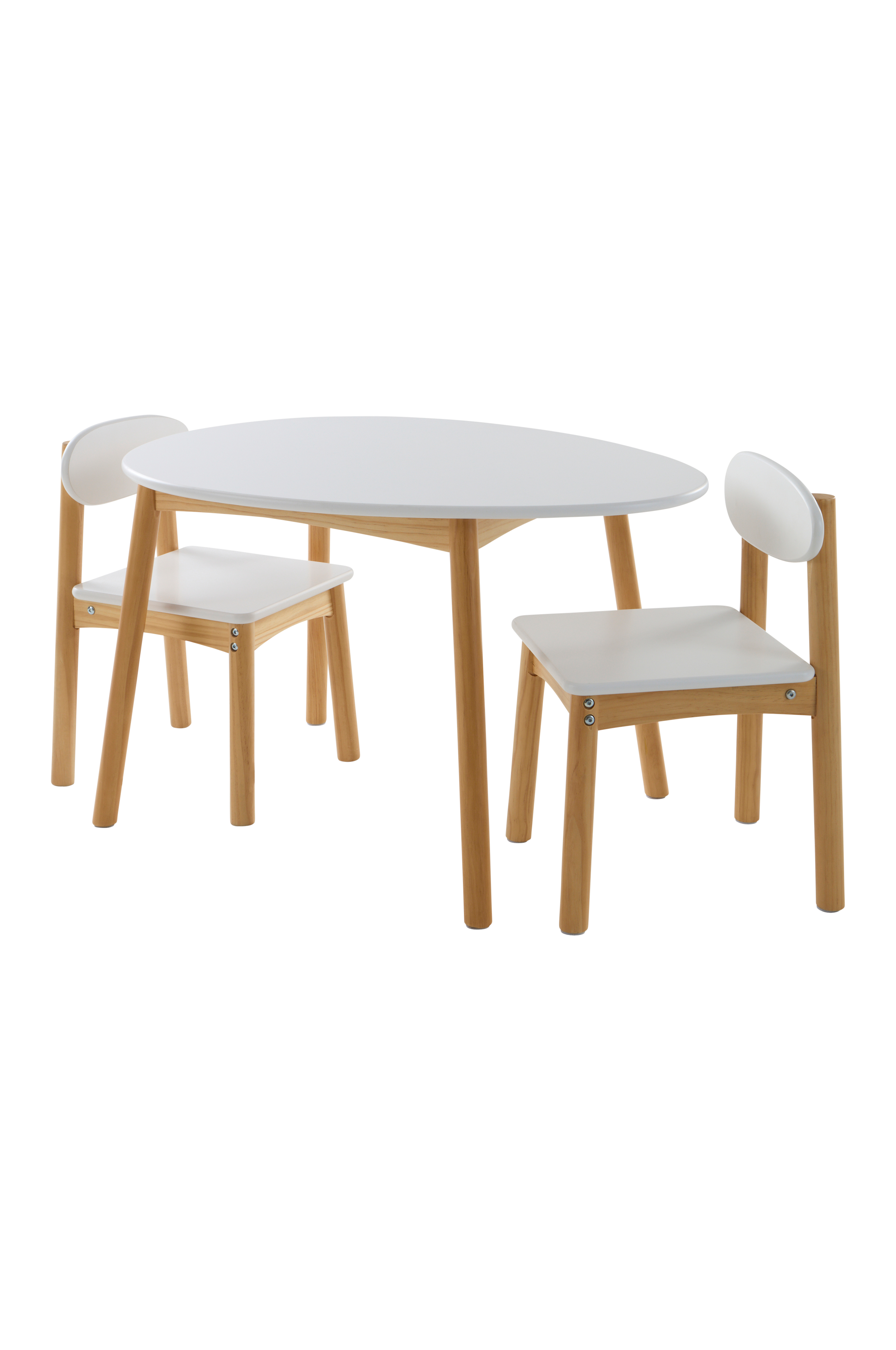 HULTA MINI on setti, joka koostuu munanmuotoisesta pöydästä ja kahdesta tuolista 2-8-vuotiaille lapsille. Pöytälevy ja tuolien istuimet on valmistettu MDF-levystä.