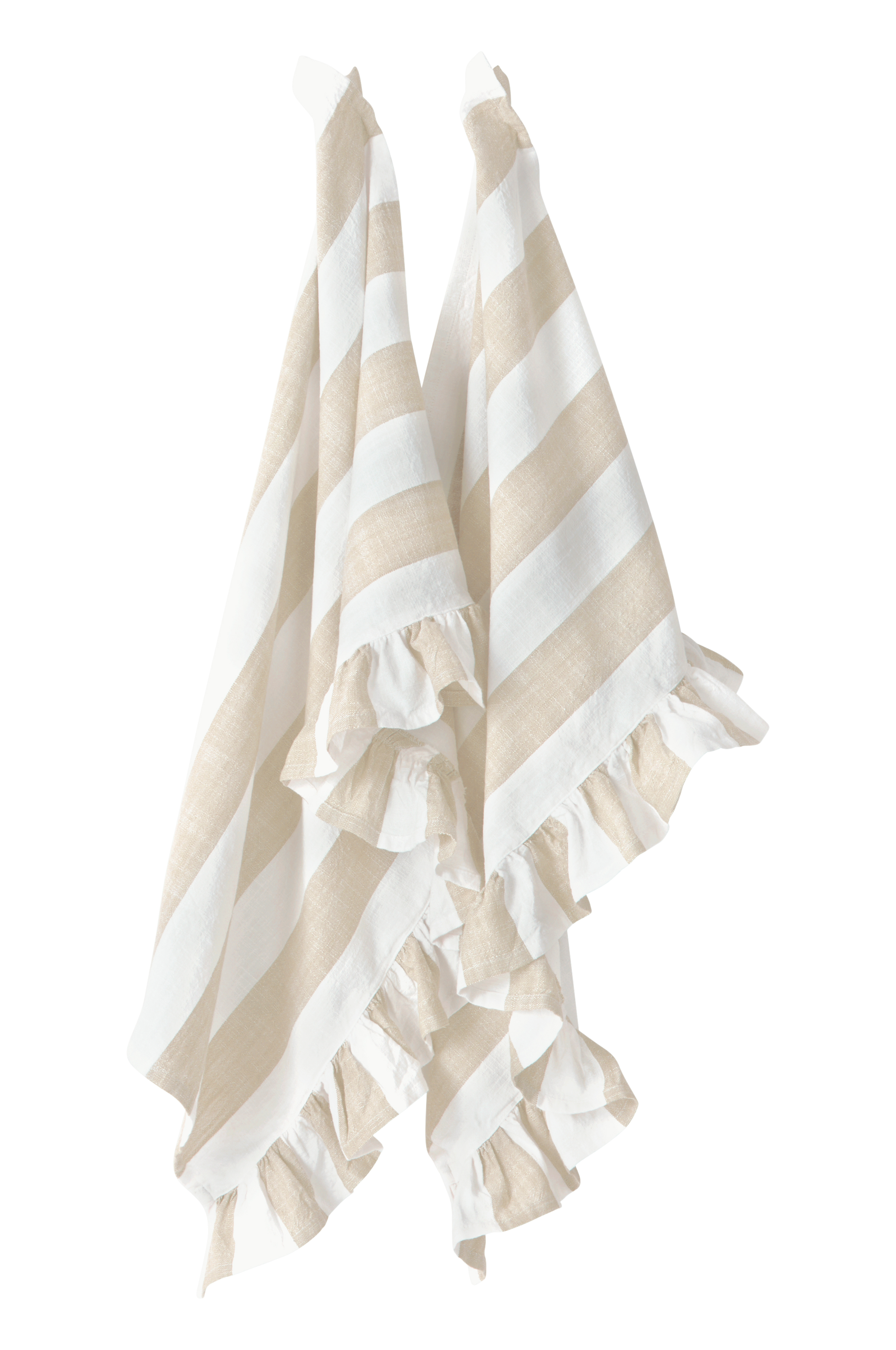 IRIS-keittiöpyyhkeet tuovat viehätystä jokaiseen keittiöön tyylikkään röyhelönsä ansiosta. Nämä pehmeästä puuvillasta valmistetut lankavärjätyt raidalliset pyyhkeet huokuvat vintage-tunnelmaa ja sopivat erilaisiin sisustuksiin. Settiin kuuluu kaksi pyyhettä, joissa yhdistyvät nostalginen viehätysvoima ja päivittäinen käytännöllisyys.