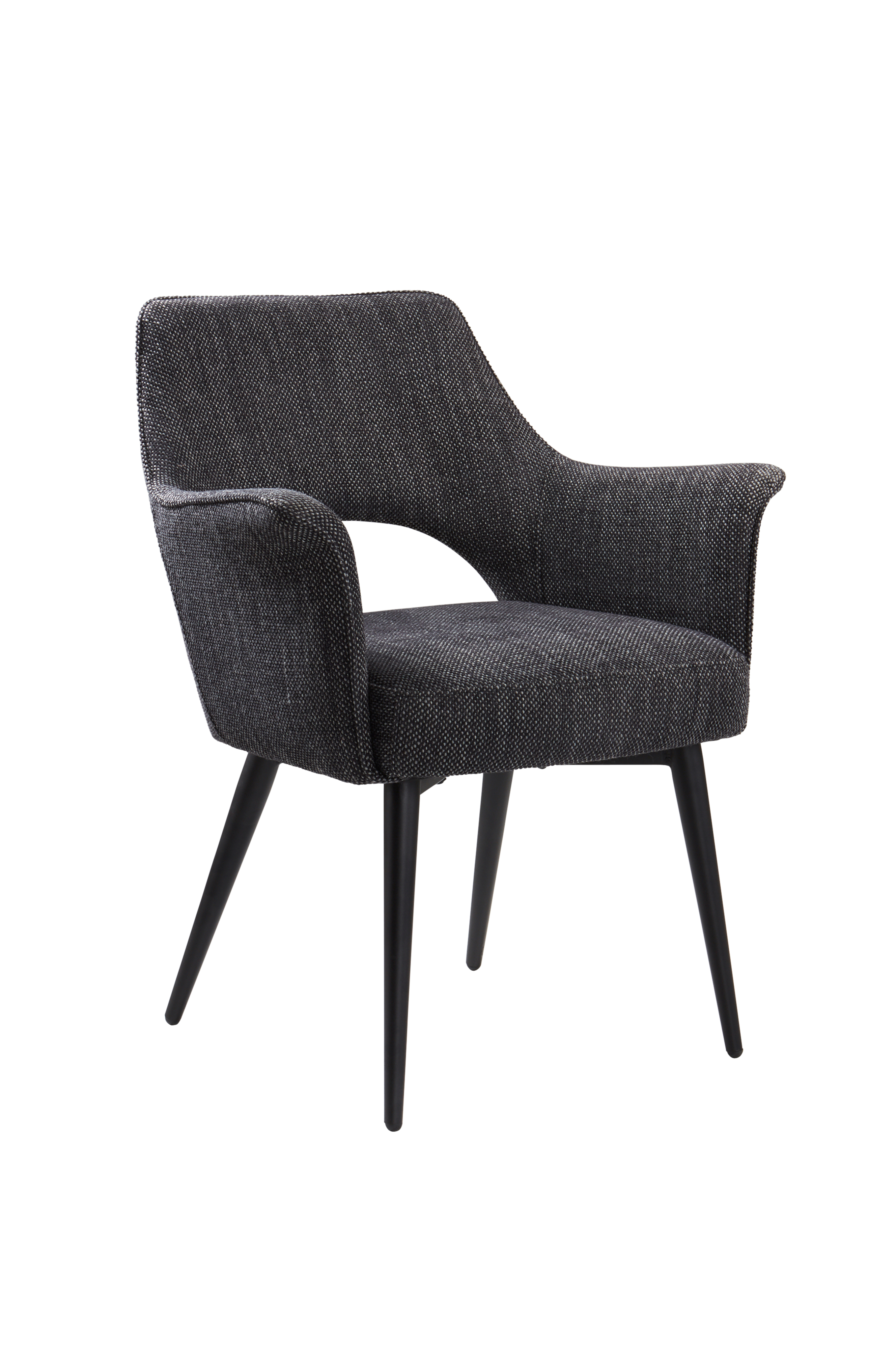 Käsinojallinen tuoli, jonka pehmustetussa istuintyynyssä polyesteripäällinen. Tyylikkäästi muotoillut jalat terästä. JESOLO on tyylikäs käsinojallinen tuoli, jossa on pehmeä vaahtomuovitäyte. Tuolissa on mukava istua keittiön pöydän ympärillä. Päällinen on paksuhkoa ja kevyesti meleerattua kangasta. Kestävän kankaan Martindale-arvo on 50 000. Päällistä ei voi irrottaa. Osittain koottava. Kokoamisohje mukana.
