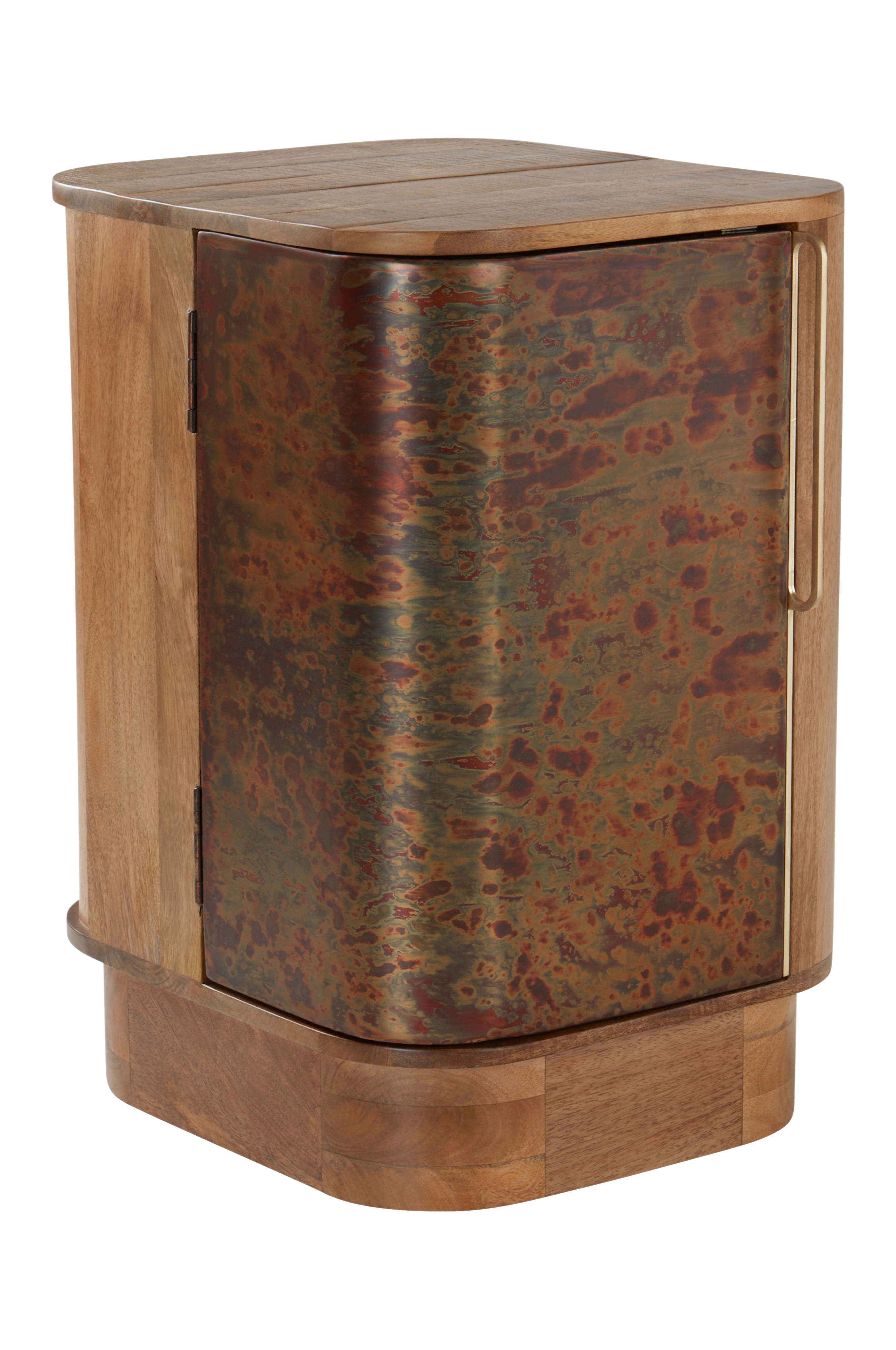 Yöpöytä massiivista mangopuuta, jossa puun luonnolliset syyt näkyvissä. Ovi tyylikästä oksidoitua terästä. Oksidoidun pinnan ainutlaatuinen kuvio muistuttaa öljyä vedessä. Ovessa tukeva messinkikahva. Nämä ominaisuudet yhdessä tyylikkään mangopuun kanssa tekevät JORO-yöpöydästä huonekalun, joka erottuu joukosta. Kevyt ovi pysyy kiinni magneettilukolla. Voit valita oikealle tai vasemmalle aukeavan oven. Mikäli sinulla on parivuode, saat yöpöydän molemmille puolille. Oven takana yksi kiinteä hyllytaso. JORO on kätevä huonekalu, joka ottaa paikkansa ja antaa huoneelle luonnetta.