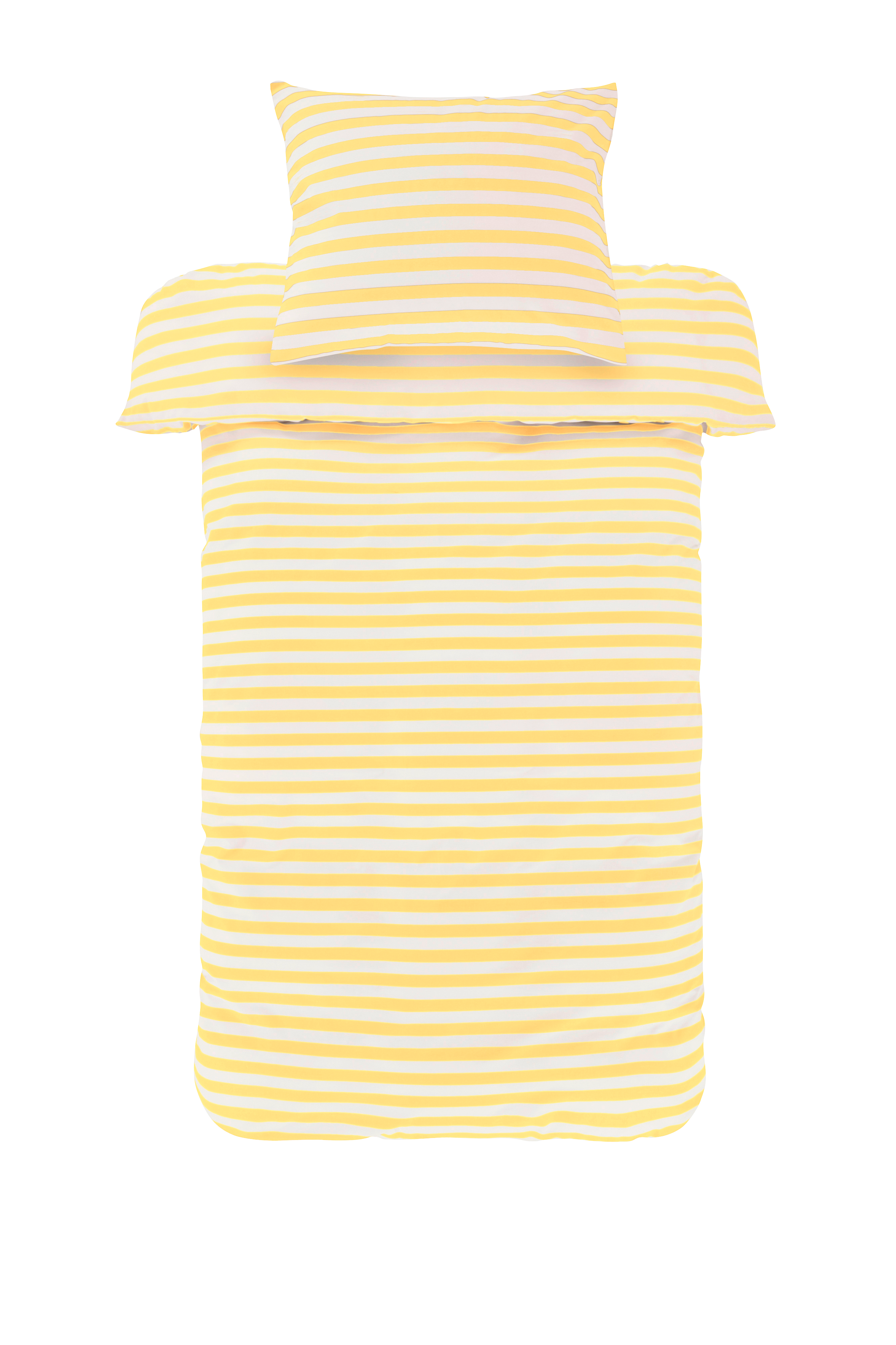 Kaksiosainen raidallinen pussilakanasetti, jossa pussilakana ja tyynyliina puuvillaa. Raikkaat kesäisen väriset poikkiraidat on painettu tyynyliinan ja pussilakanan molemmille puolille. Puuvilla on pehmeä ja miellyttävä materiaali, joka tuntuu viileältä ihoa vasten. Pussilakanan yläkulmissa on aukot, jotka helpottavat pussilakanan vetämistä peiton päälle. Langantiheys 144 tc. (Langantiheys kertoo lankojen lukumäärän/neliötuuma. Mitä suurempi langantiheys, sitä laadukkaampi materiaali. Poikkeuksena pellava, joka kudotaan usein hieman harvemmaksi halutun tunnun saavuttamiseksi.)