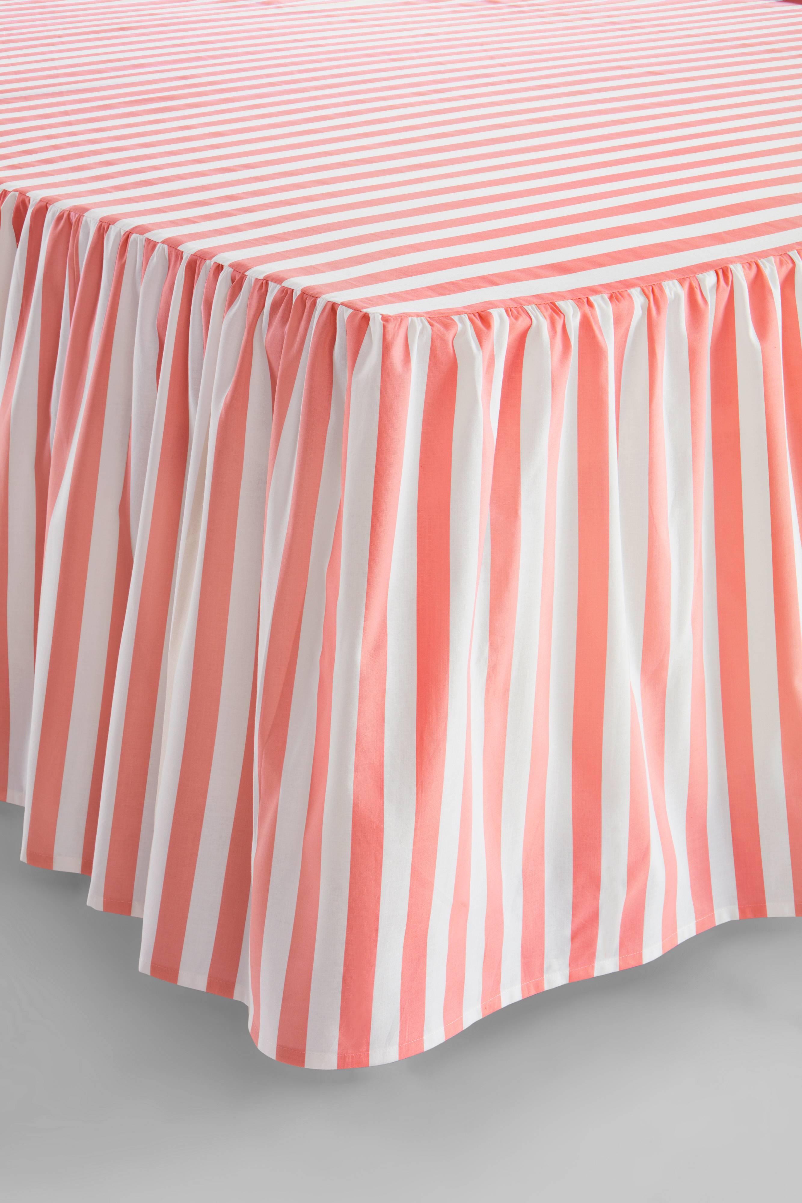 KAYO-sängyn reunusverhoilu, jossa on röyhelö, lisää tyylikkyyttä makuuhuoneen sisustukseen. Siinä on viehättävä raidallinen kuvio, ja se on osa KAYO-perhettä, jossa on vastaavia tuotteita. Täydellinen romanttisen mutta modernin säväyksen tuomiseksi makuuhuoneeseesi.