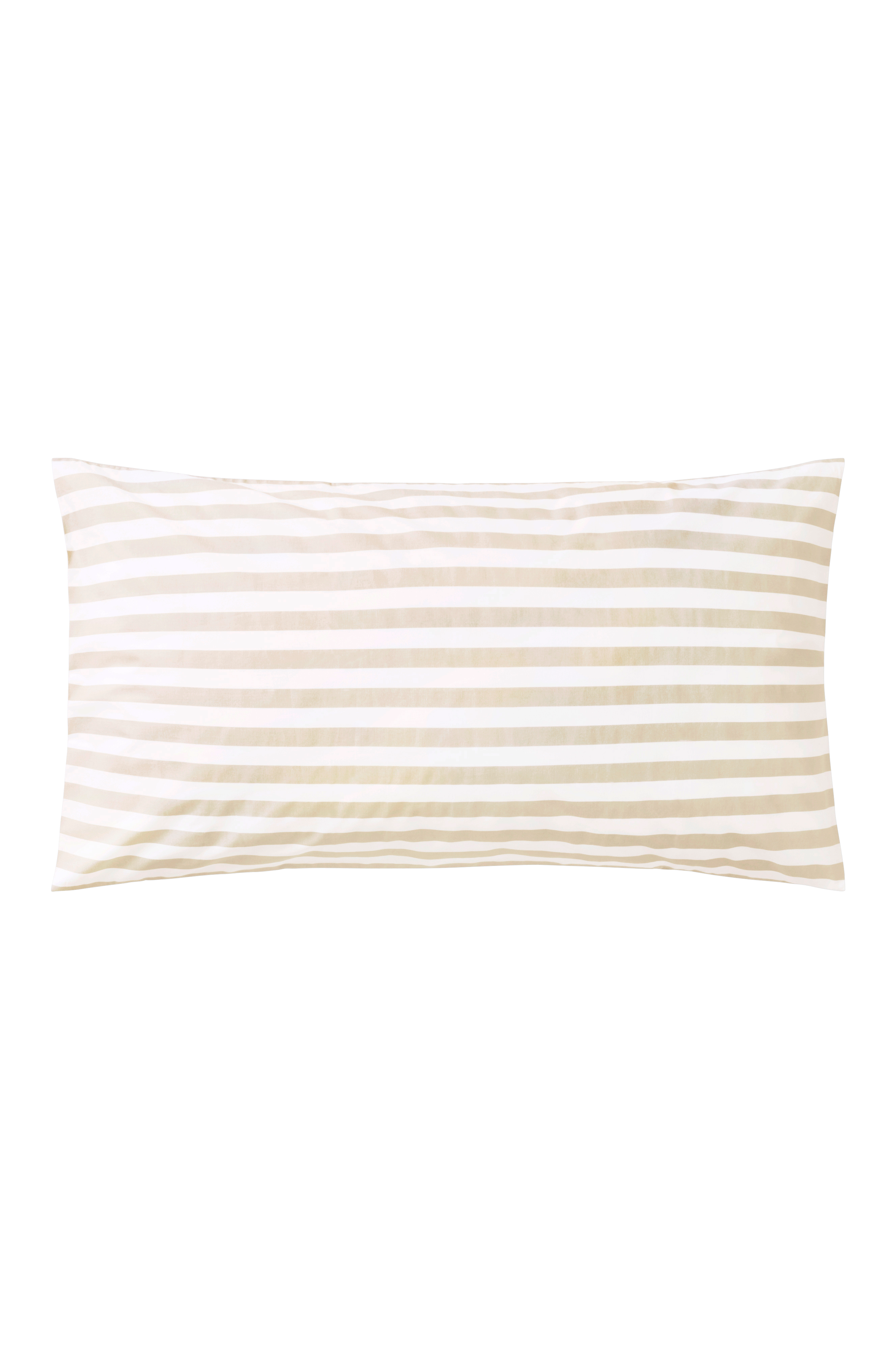 Tyynyliina raidallista puuvillaa, 1/pakkaus. Raikkaat kesäisen väriset poikkiraidat on painettu tyynyliinan molemmille puolille. Puuvilla on pehmeä ja miellyttävä materiaali, joka tuntuu viileältä ihoa vasten. Langantiheys 144 tc. (Langantiheys kertoo lankojen lukumäärän/neliötuuma. Mitä suurempi langantiheys, sitä laadukkaampi materiaali. Poikkeuksena pellava, joka kudotaan usein hieman harvemmaksi halutun tunnun saavuttamiseksi.)