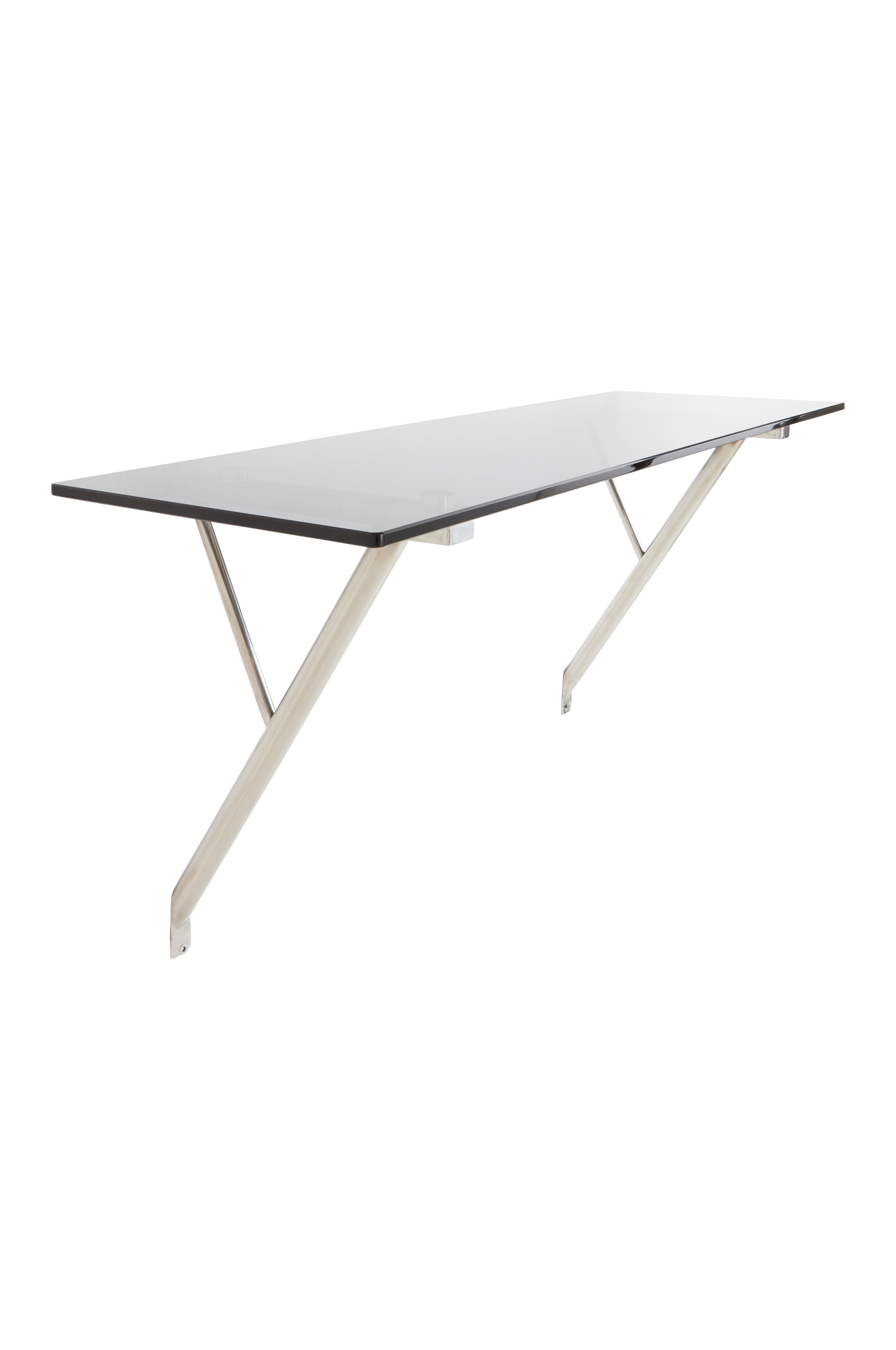 Seinään kiinnitettävä tyylikäs kirjoituspöytä lasia ja krominväristä ruostumatonta terästä. Kätevä malli, joka kiinnitetään seinään halutulle korkeudelle. Pöytä on trendikäs ja pelkistetty ja helppo sijoittaa myös pieneen kotiin. Osittain koottava. Kokoamisohje mukana.