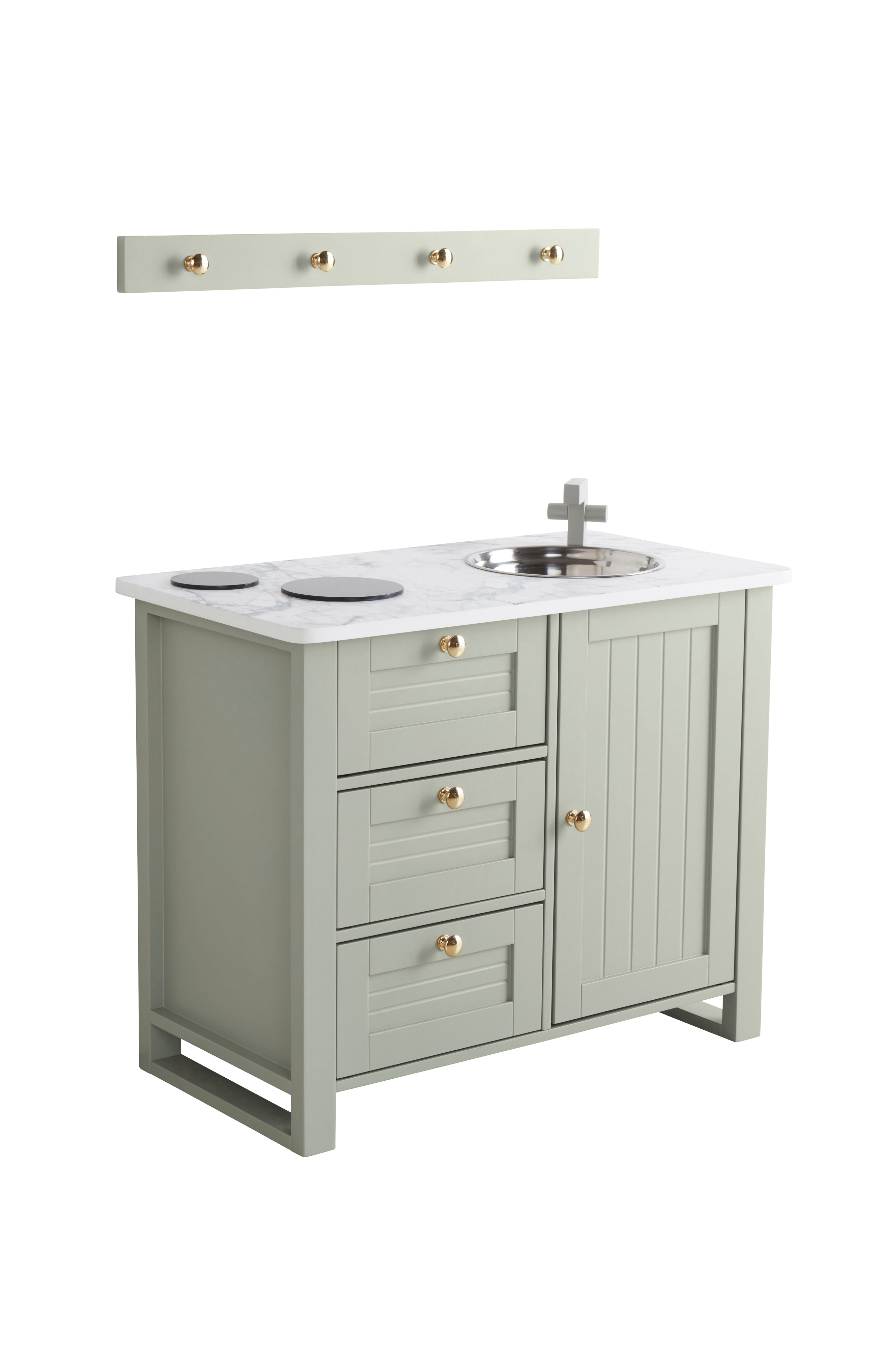Leikkikeittiö maalattua MDF-levyä. Marmorisen näköiseksi maalattu pöytälevy. Mukana naulakko. Keittiössä on avattavat kaapit, joissa hyllyt ja sievät nuppivetimet. Tuote on CE-merkitty ja täyttää EU:n voimassa olevien lelusäännösten vaatimukset. Toimitetaan osina. Kokoamisohje mukana.