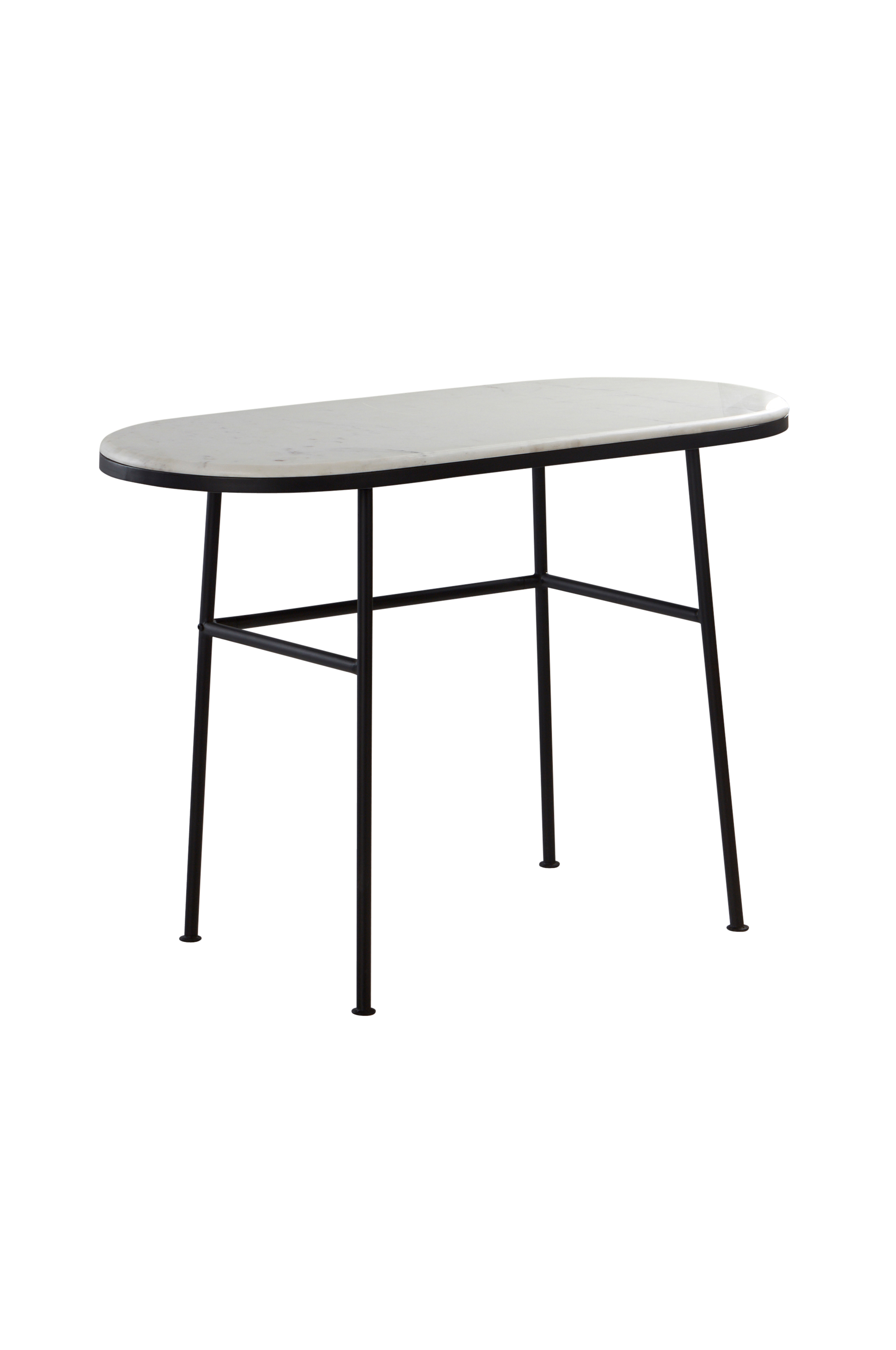 Kirjoituspöytä jauhemaalattua metallia, pöytälevy marmoria. Pöytälevyn pyöristetyt kulmat antavat pehmeän vaikutelman. Osittain koottava. Kokoamisohje mukana.