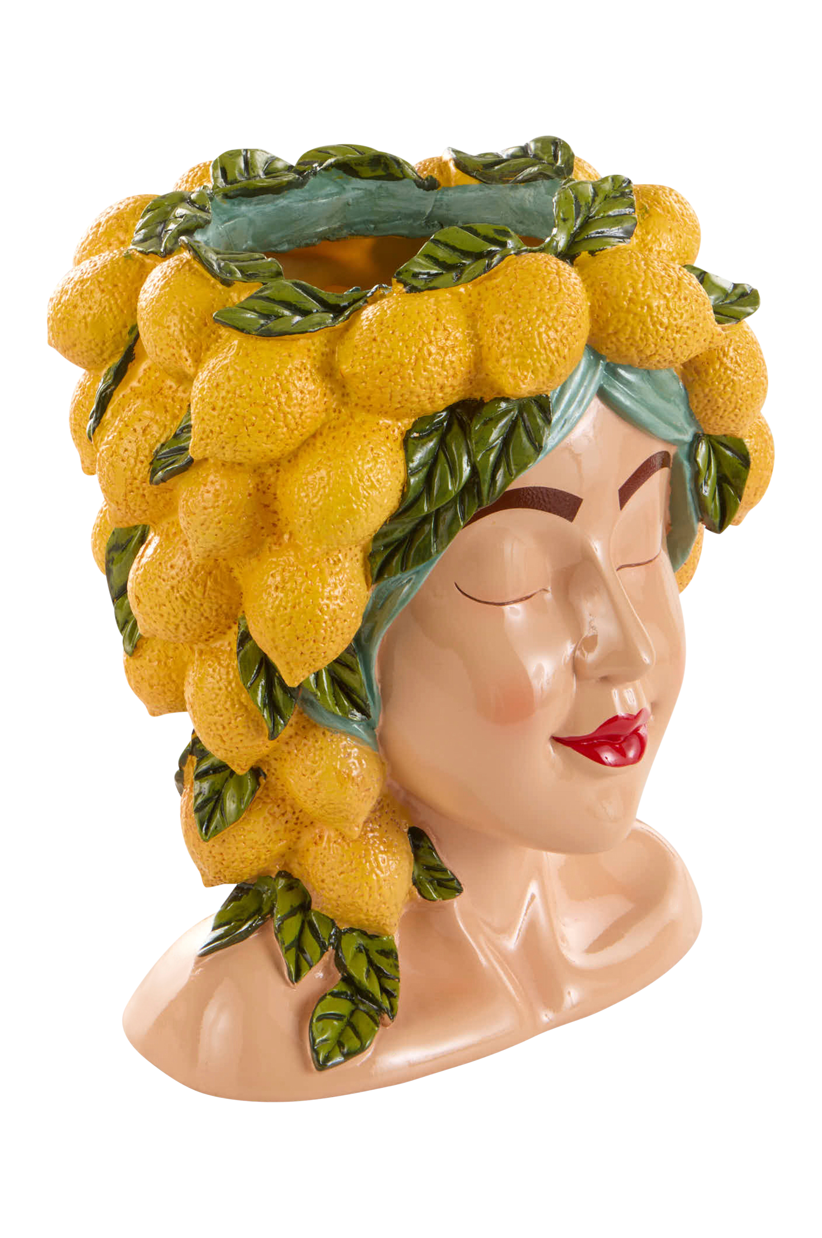 Maljakko LADY LEMON, jossa on hedelmien ja lehtien koristama monimutkainen kasvokuvio, on valmistettu hartsista, jossa on kiiltävä viimeistely. Se toimii elinvoimaisena koriste-esineenä, joka sopii täydellisesti kukkien esittelyyn tai itsenäisenä keskipisteenä, joka lisää taiteellista charmia mihin tahansa huoneeseen.