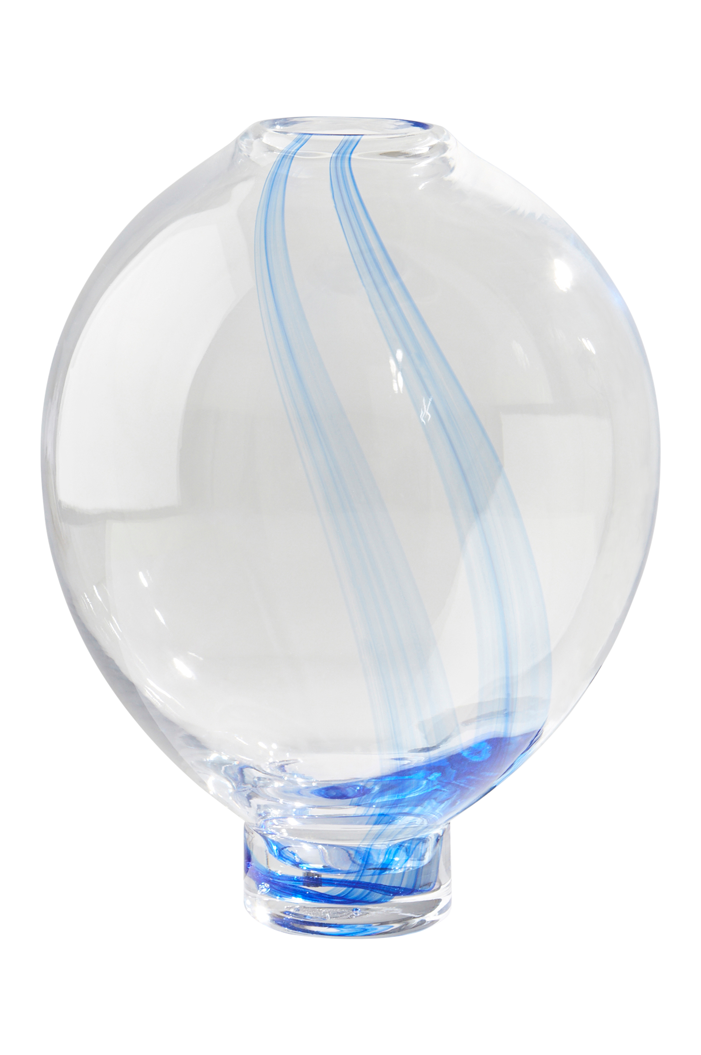 Käsintehty lasimaljakko kirkasta lasia, jossa siniset viirut. Kauniinmuotoinen kirkas lasimaljakko ja sen viirut luovat rauhallisen vaikutelman. Laita maljakkoon kukkakimppu tai yksittäinen ruusu, ja se luo harmoniaa ja lämmintä tunnelmaa mihin tahansa huoneeseen. Käsityö tekee jokaisesta maljakosta yksilöllisen.