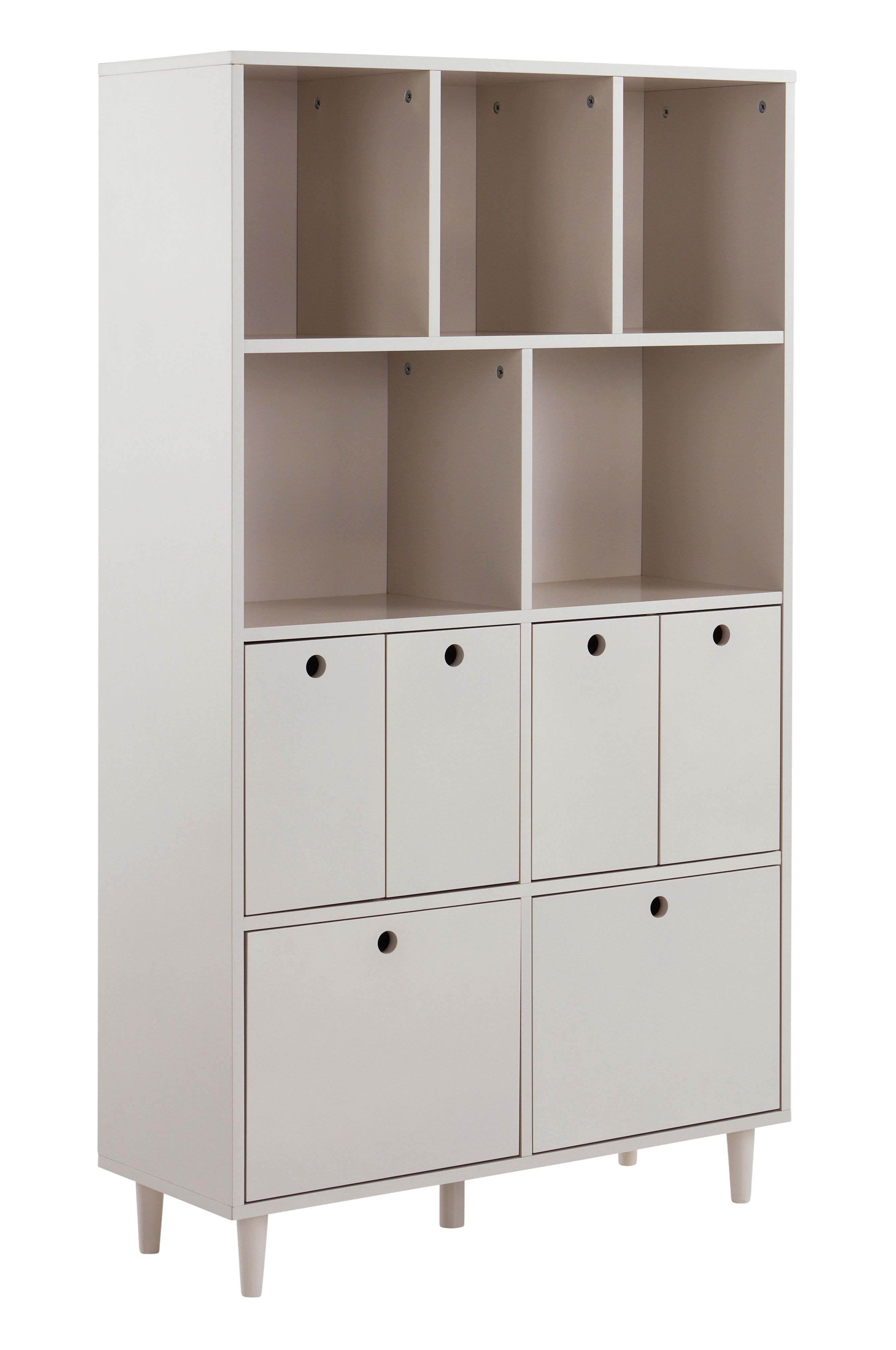 Kirjahylly maalattua MDF-levyä. Puunväriset jalat ovat tyylikäs yksityiskohta. Kirjahyllyssä on viisi avolokeroa ja kuusi vetolaatikkoa. Laatikoiden pyöreät kolot toimivat vetiminä. LOUVIERE-hyllyssä on runsaasti tilaa kirjoille, ja lisäksi laatikot ovat kätevä säilytysratkaisu. LOUVIERE on omiaan lastenhuoneeseen, sillä siihen mahtuvat niin kirjat, lelut kuin vaatteetkin. Mukana kaatumissuoja, joka kiinnitetään seinään 136 cm:n korkeudelle lattiasta. Osittain koottava. Kokoamisohje mukana.