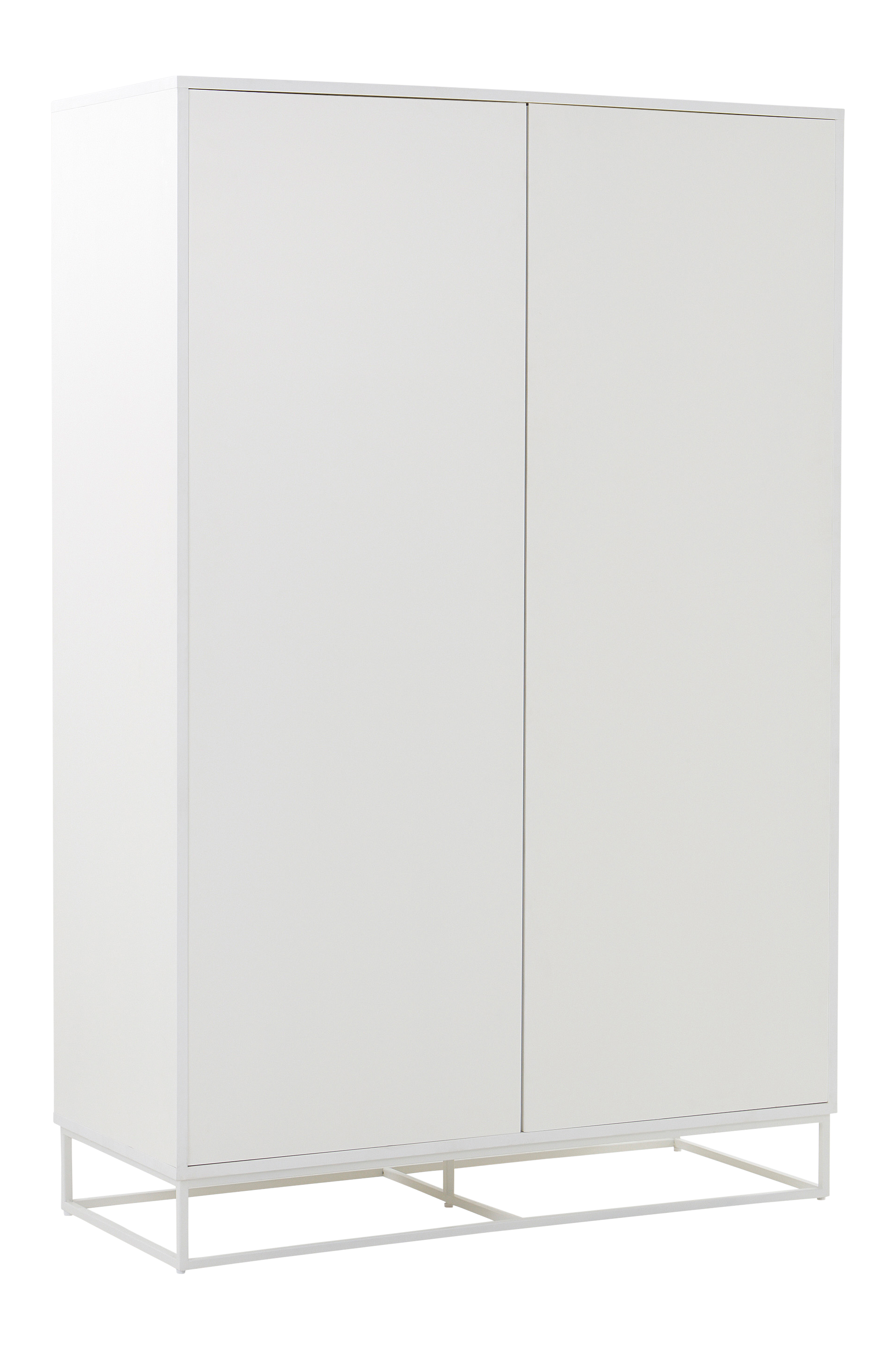 Vaatekaappi MDF-levyä, metallijalusta. Pelkistetyssä ja tyylikkäässä vaatekaapissa on kaksi ovea, joissa push-toiminto. Toiminnon ansiosta vaatekaappi on sileä ja kahvaton, silti helppo avata. Vaatekaappi on kaksiosainen. Vasemmalla puolella on vaatetanko massiivista pyökkiä ja yksi kiinteä hyllytaso. Oikealla puolella on kolme siirrettävää hyllytasoa. Vaatekaapin osat ovat MDF-levyä, jossa on vesipohjainen lakka. Nelikulmainen jalusta on jauhemaalattu. Seinäkiinnikkeiden ansiosta vaatekaappi voidaan kiinnittää seinään tarvittaessa. Osittain koottava. Kokoamisohje mukana.