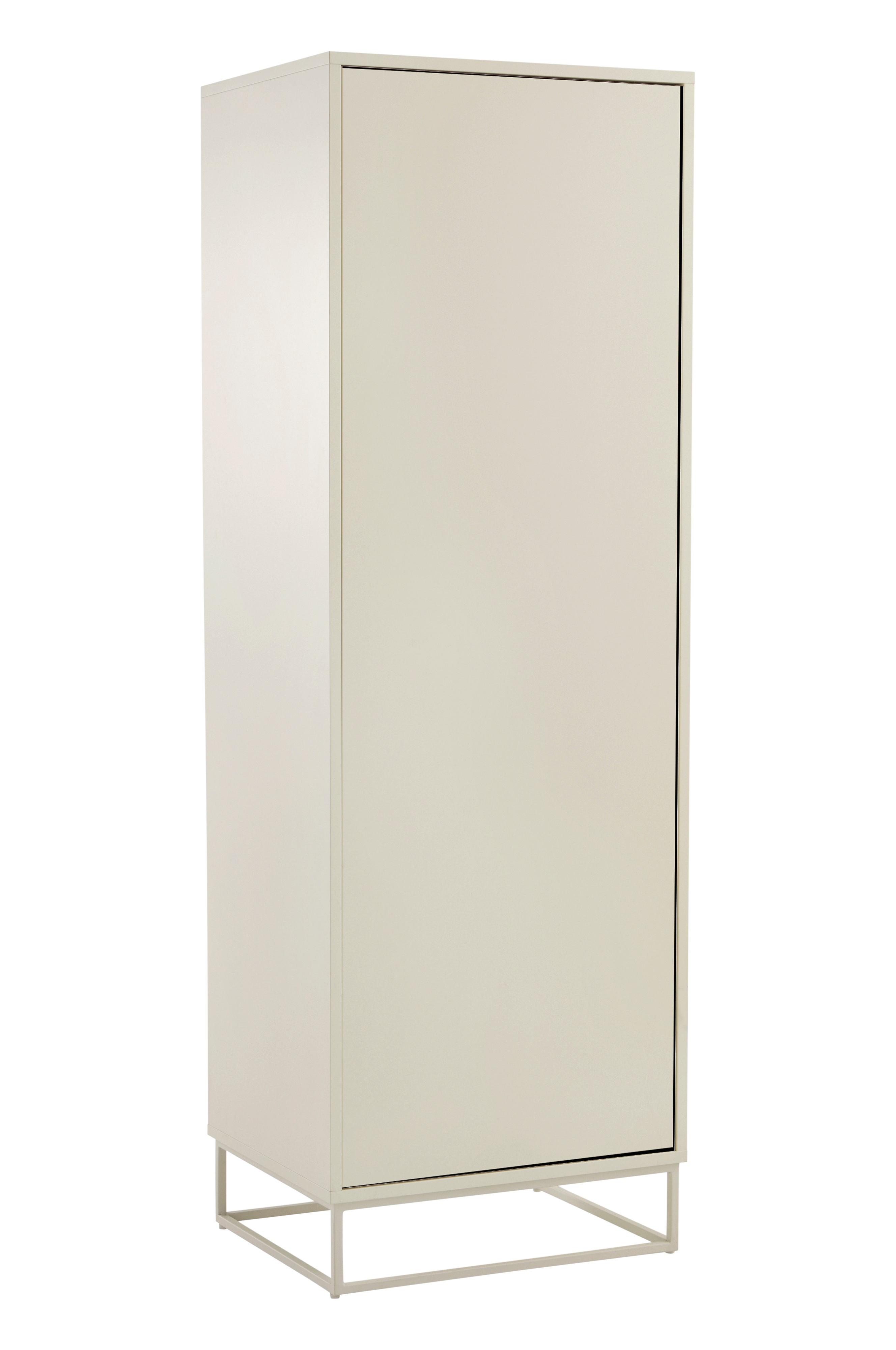 Vaatekaappi MDF-levyä, metallijalusta. Pelkistetyn linjakkaan vaatekaapin ovessa on push-toiminto. Sen ansiosta kaapin pinta on täysin sileä ja ovi avautuu vaivattomasti ilman vedintä. Vaatekaapin sisällä on vaatetanko massiivipyökkiä ja yksi kiinteä hyllytaso. Saranat ovat vasemmalla puolella. Oven kätisyys voidaan vaihtaa, mutta ota huomioon, että vasemmalle puolelle jää reiät. MDF-levystä valmistetut osat on käsitelty vesiohenteisella lakalla. Nelikulmainen jalusta on jauhemaalattu. Seinäkiinnikkeiden ansiosta vaatekaappi voidaan kiinnittää seinään tarvittaessa. Osittain koottava. Kokoamisohje mukana.