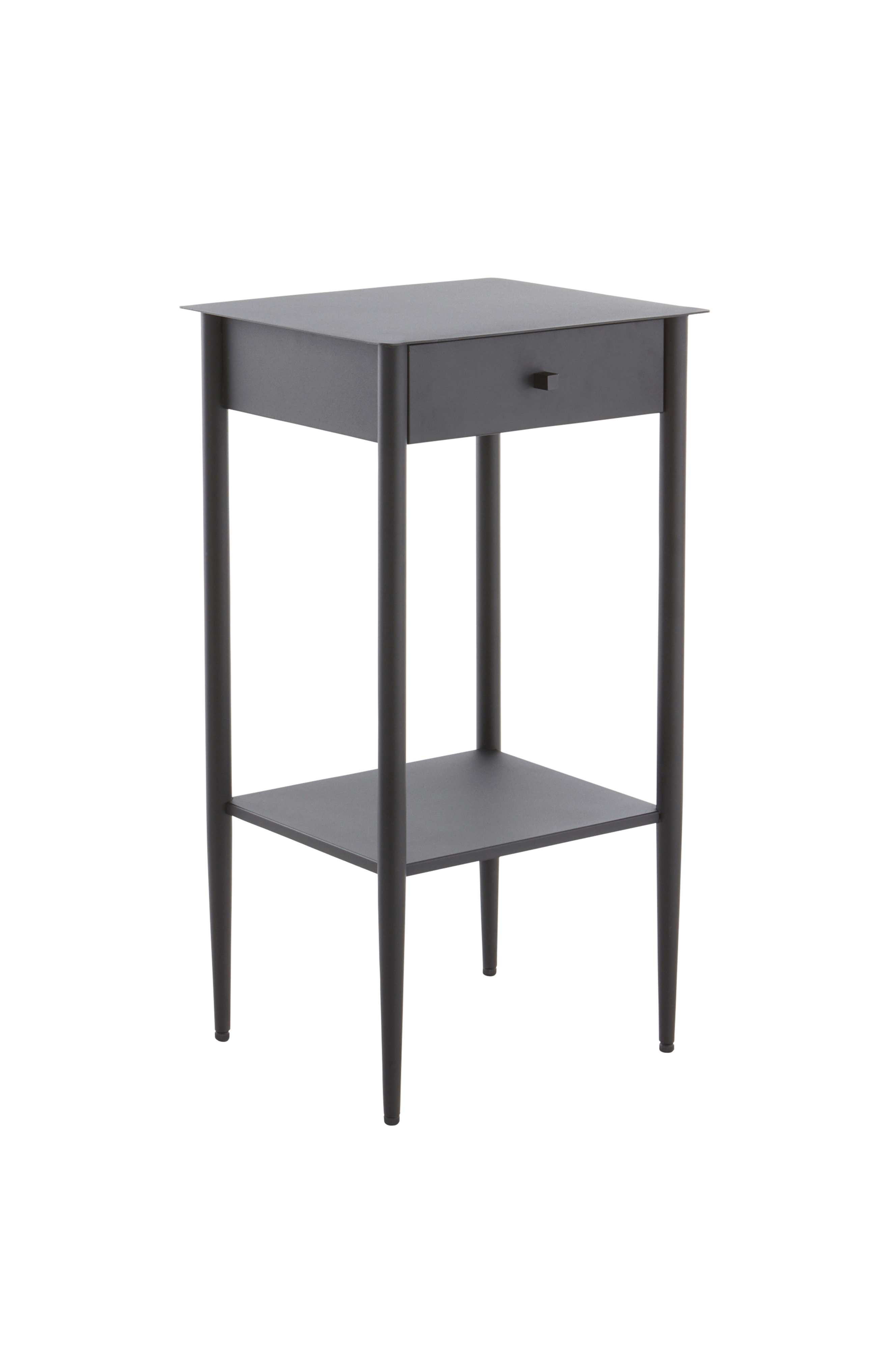 Sivupöytä jauhemaalattua terästä. Yksi laatikko ja hylly. Laatikon vedin on vaihdettava, joten voit helposti muunnella sivupöydän ilmettä. Mukana kolme vedintä - yhteensopivan värinen kulmikas metallinuppi, pyöreä messinkinuppi ja kulmikas messinkinuppi. LYNTON on ylellinen ja tyylikkään muotoinen pöytä, joka sopii hyvin sohvan viereen. Se on myös kaunis sisustuselementti kotiisi.