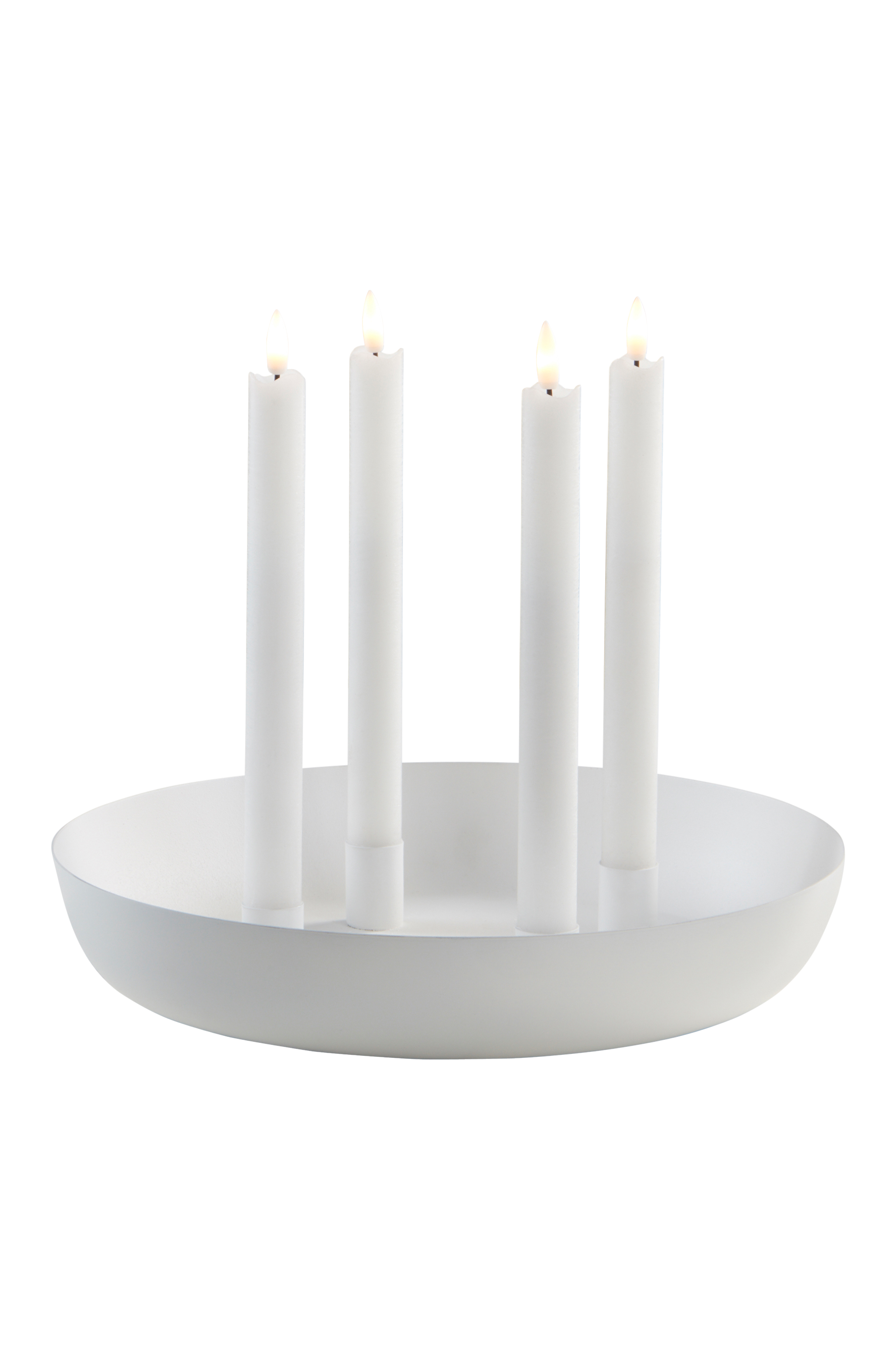 Rautainen kynttelikkö, jossa pidike neljälle steariinikynttilälle. Neljä kynttilänpidikettä ovat pyöreällä vadilla, joka on kaunis sellaisenaan tai vaikka pienillä pyöreillä kivillä täytettynä. Huomioi paloturvallisuus valitessasi vadille koristeita. Kynttelikössä on mattapinta. Kynttilät eivät sisälly toimitukseen.