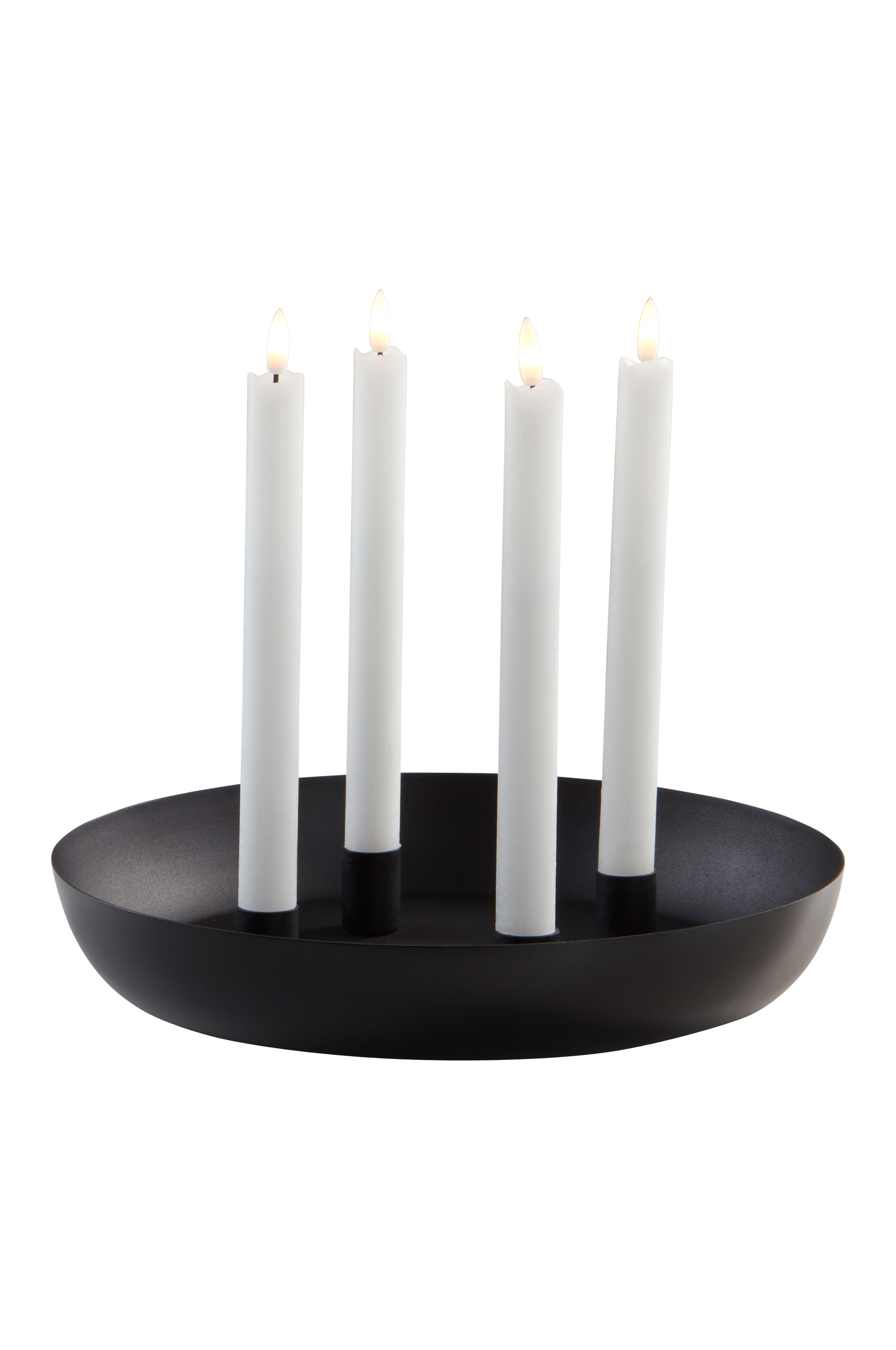 Rautainen kynttelikkö, jossa pidike neljälle steariinikynttilälle. Neljä kynttilänpidikettä ovat pyöreällä vadilla, joka on kaunis sellaisenaan tai vaikka pienillä pyöreillä kivillä täytettynä. Huomioi paloturvallisuus valitessasi vadille koristeita. Kynttelikössä on mattapinta. Kynttilät eivät sisälly toimitukseen.