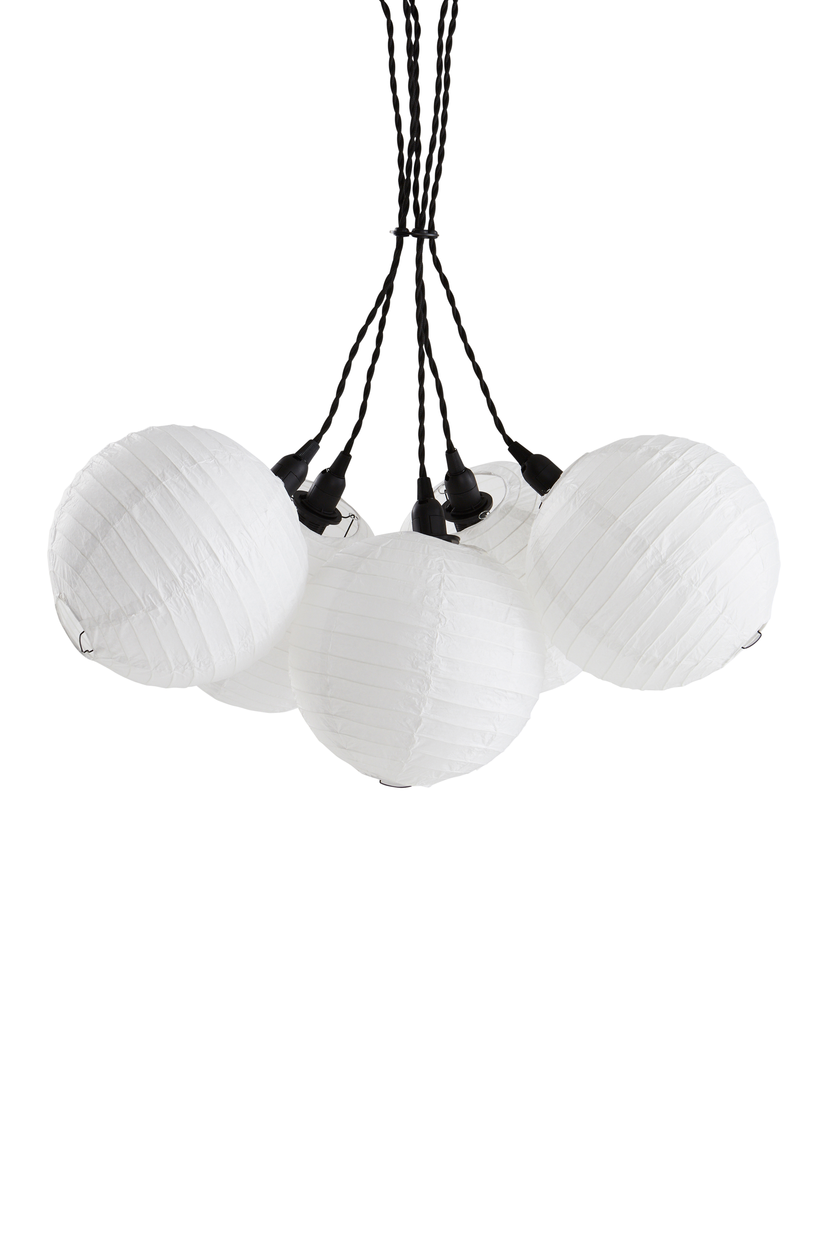 Kattovalaisin, jossa viisi pyöreää paperivarjostinta. Jokaisessa pallossa on musta metallinen lampunkanta. Paperivarjostin antaa pehmeän valon. Kodikas valaisin esimerkiksi lastenhuoneessa. Viisi mustaa ja tyylikkäästi kierrettyä kangasjohtoa. Musta kattokuppi metallia. Valaisin on maadoitettu, luokka 1. EU-sääntöjen vuoksi tietyissä maissa vaaditaan erillinen kattopistoke. Kattopistokkeen tulee olla maadoitettu (luokka 1), ja se ostetaan erikseen.