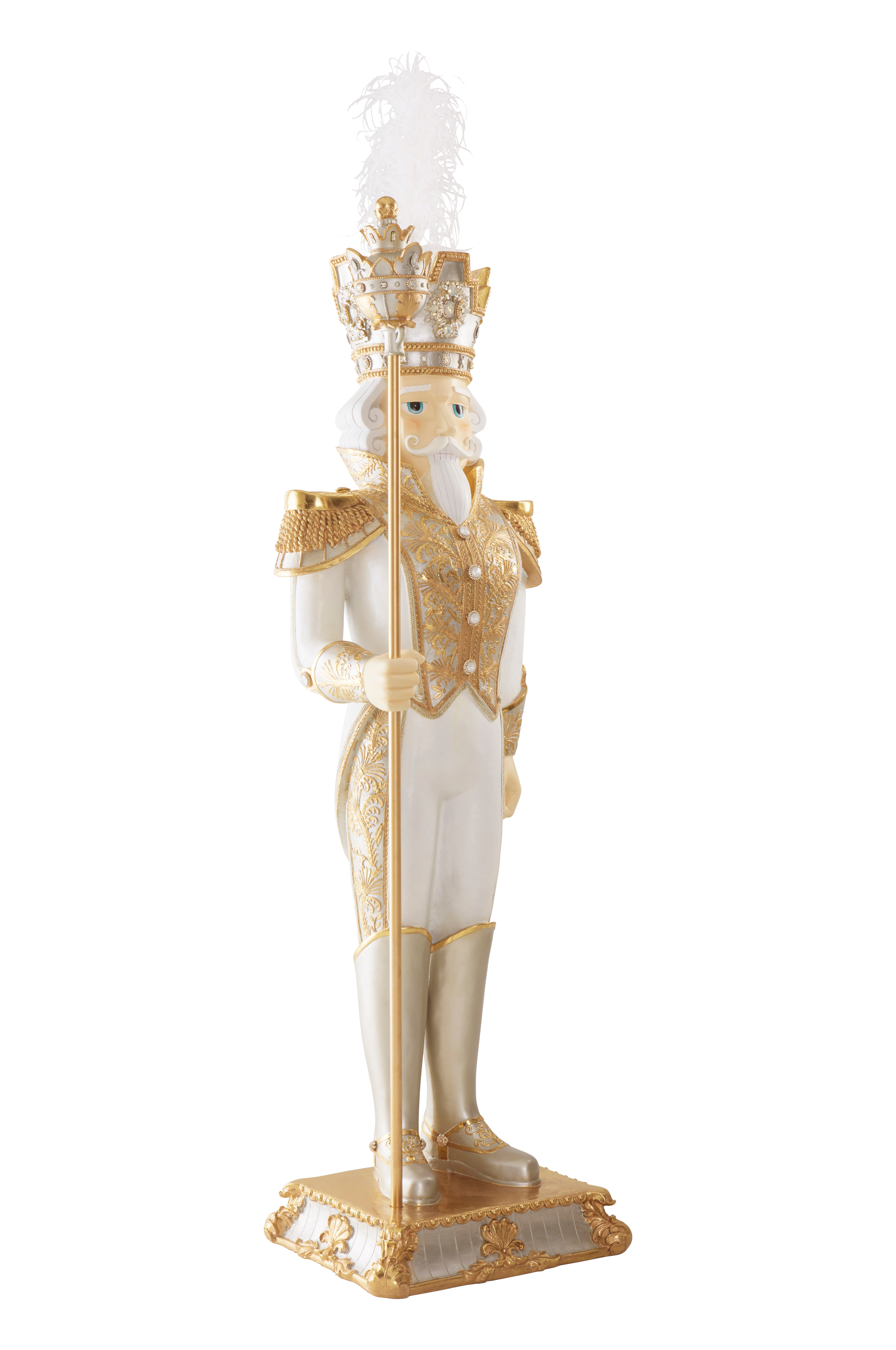 Erittäin suuri ja loistokas pähkinänsärkijä polyresiiniä. Valkoisia ja kullanvärisiä sävyjä, koristekiviä ja kimalletehoste. Jännittävä koriste on 178 cm korkea ja tulee varmasti herättämään huomiota.