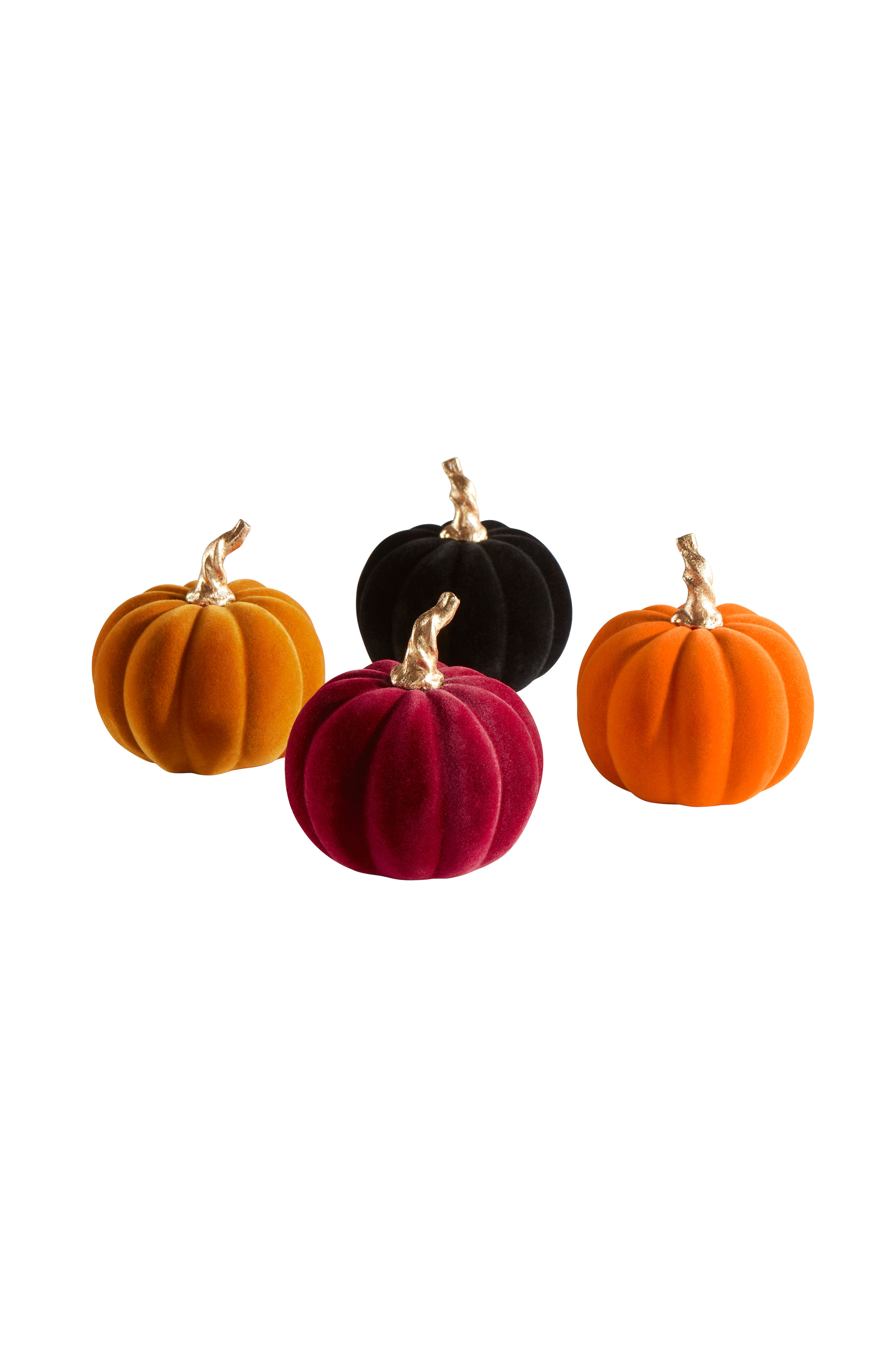 4 koristekurpitsaa sametin tuntuista polyresiiniä. Pakkauksessa on neljä eri väristä kurpitsaa. Kaikissa on pieni kullanvärinen kanta ylhäällä.
