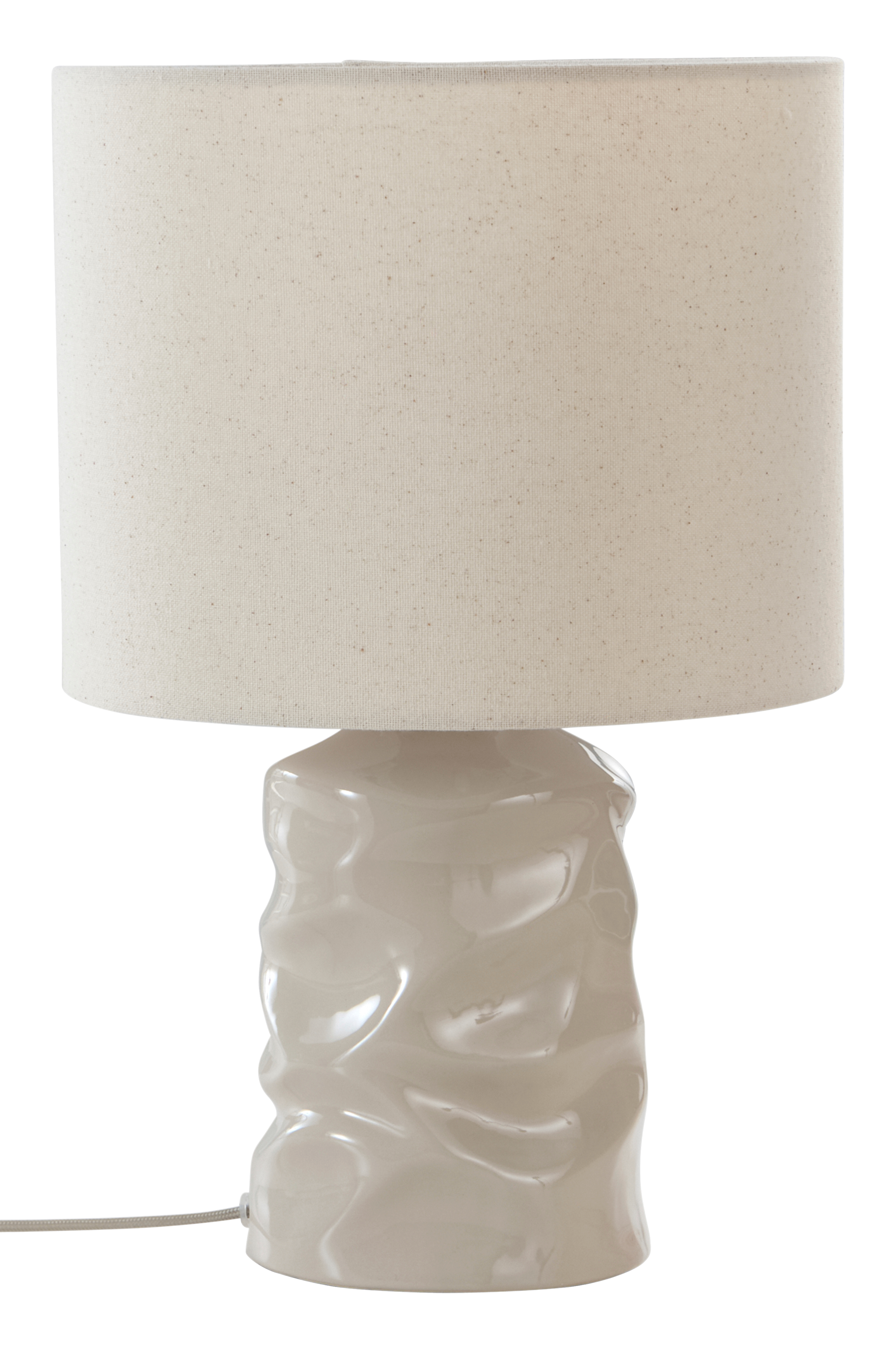 MILERA-pöytävalaisimessa on ainutlaatuinen, lasitetusta keramiikasta valmistettu ryppyinen jalusta, joka korostaa modernia sisustusta. Sen puuvillainen varjostin antaa lempeää valaistusta, joka on ihanteellinen viihtyisän tunnelman luomiseksi mihin tahansa huoneeseen. Tekstiilijohdossa on kätevä rivikytkin.