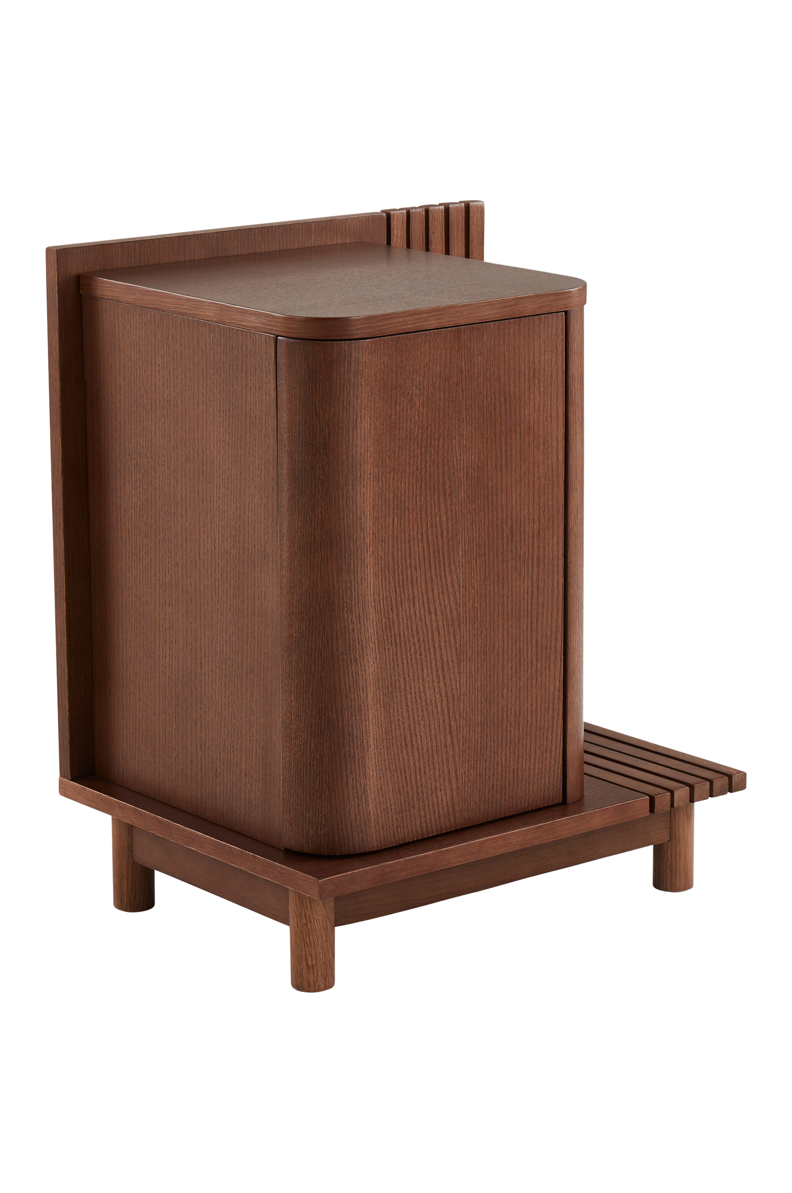 Yöpöytä massiivitammea ja tammiviilutettua MDF-levyä. Näyttävässä huonekalussa on tyylikäs muotoilu pyöristetyillä kulmilla ja pehmeillä linjoilla, jotka tuovat mieleen japanilaisen tyylin. Yöpöydässä on yksi ovi, ja sen sisäpuolella hylly kätevää säilytystä varten. Neljä pyöreää ja suoraa tammijalkaa. Huonekalu on käsitelty vesipohjaisella lakalla. Osittain koottava. Kokoamisohje mukana.