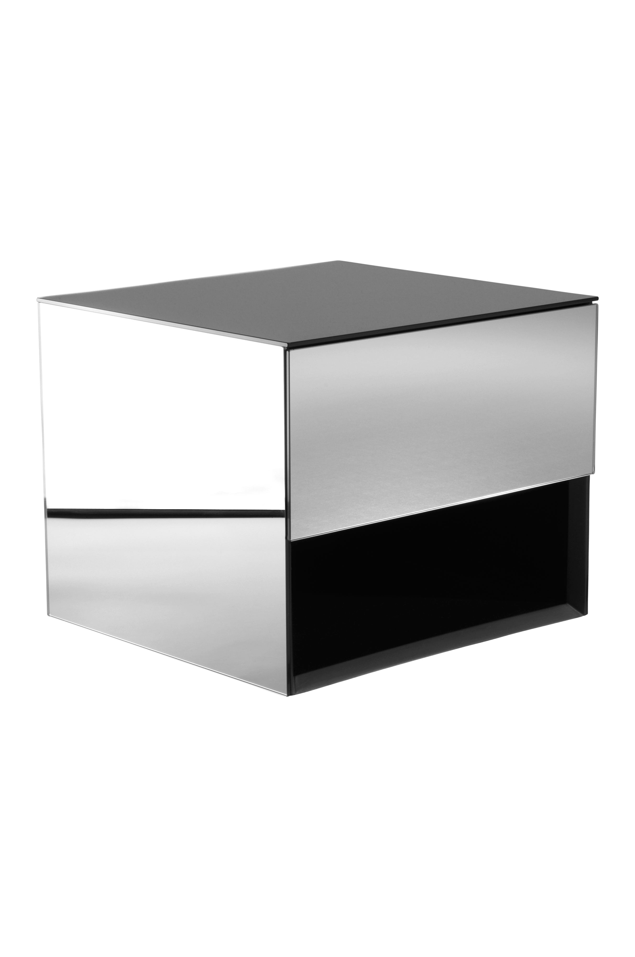 Peililasinen yöpöytä, jonka runko on FSC-sertifioitua MDF-levyä. Tämä yöpöytä on suunniteltu seinälle ripustettavaksi. Etureunan peilin takana on kaappi ja alla avohylly. Ovessa on push-toiminto ja pehmeästi sulkeutuvat saranat. Kaapin sisäpinta on musta. Yöpöydän kaikilla sivuilla on peili, ja reunat ovat mattamustat. Pöytä on helppo sijoittaa moniin eri paikkoihin kotona sen lisäksi, että se on ainutlaatuinen yöpöytä.