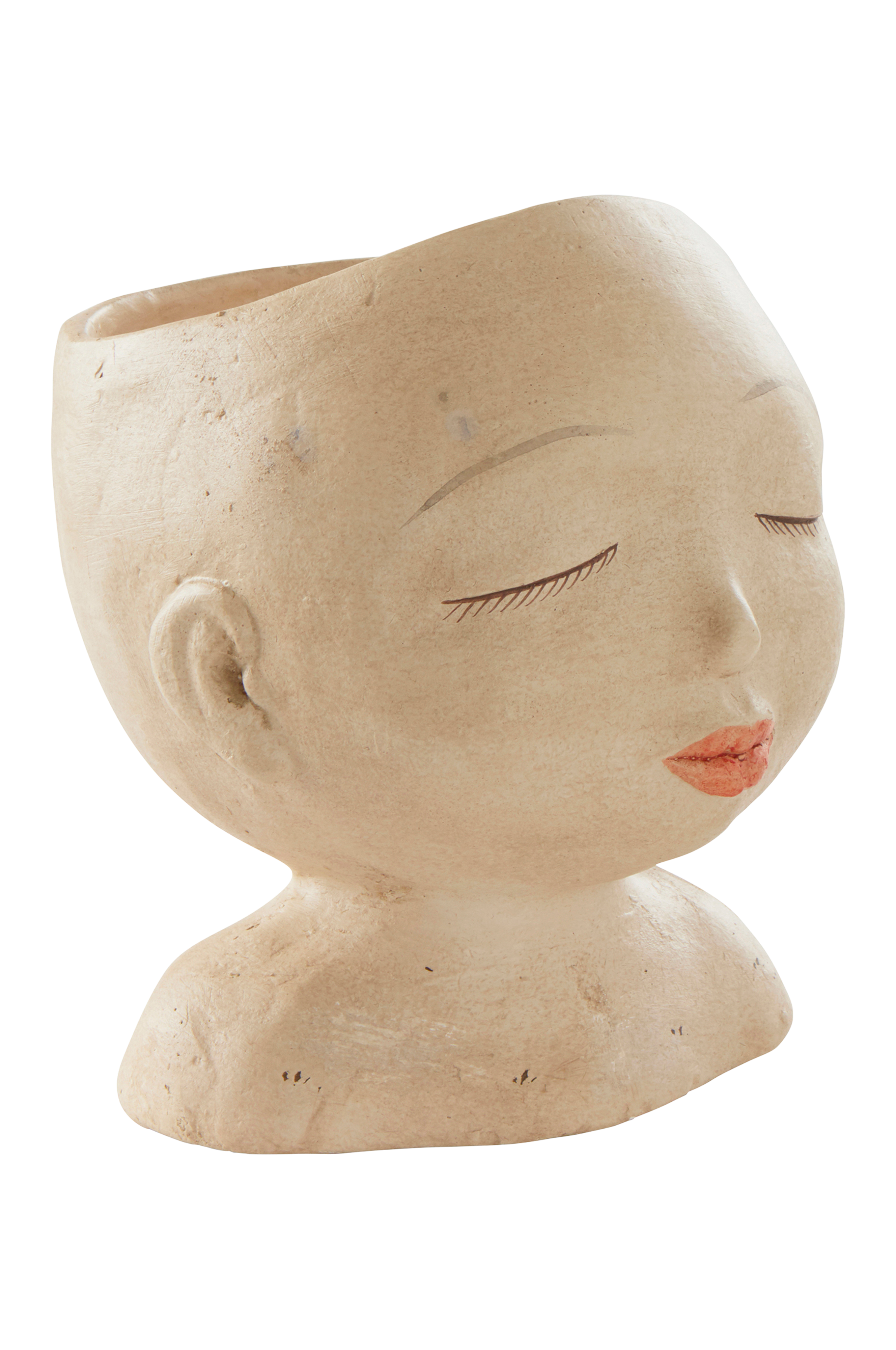 Ruukku polyresiiniä. Ruukku on pään muotoinen ja sillä on suljetut silmät. Pinta muistuttaa kalkkikiveä, jossa on hieman miellyttävää, ajan patinoimaa tunnetta.
