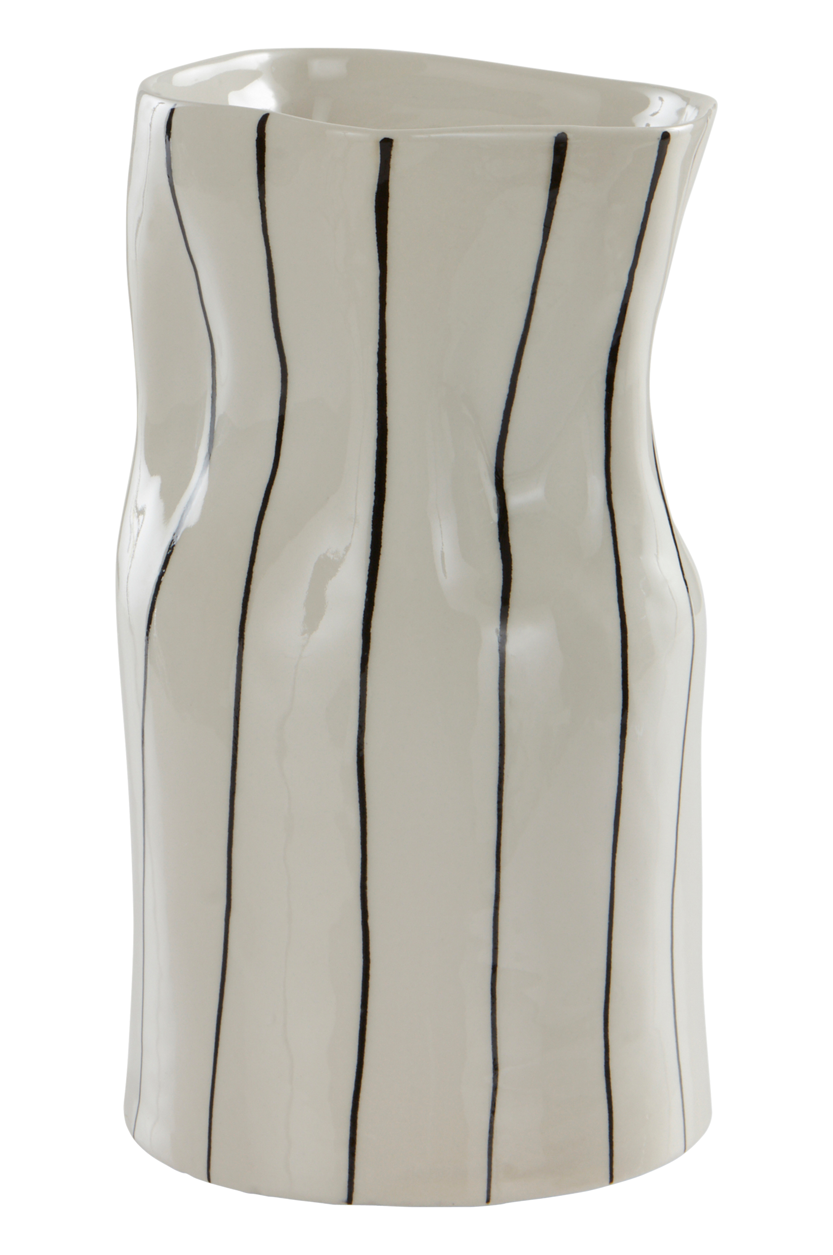 MOJ on viehättävä keramiikkamaljakko, jossa on epäsäännöllinen, hieman ryppyinen muoto ja kapeat raidat. Maljakko on lasitettu käsin kiiltävällä lasitteella, ja siinä on käsin maalatut mustat raidat. Myös sisäpinta on lasitettu. Keramiikka voi päästää kosteutta läpi.