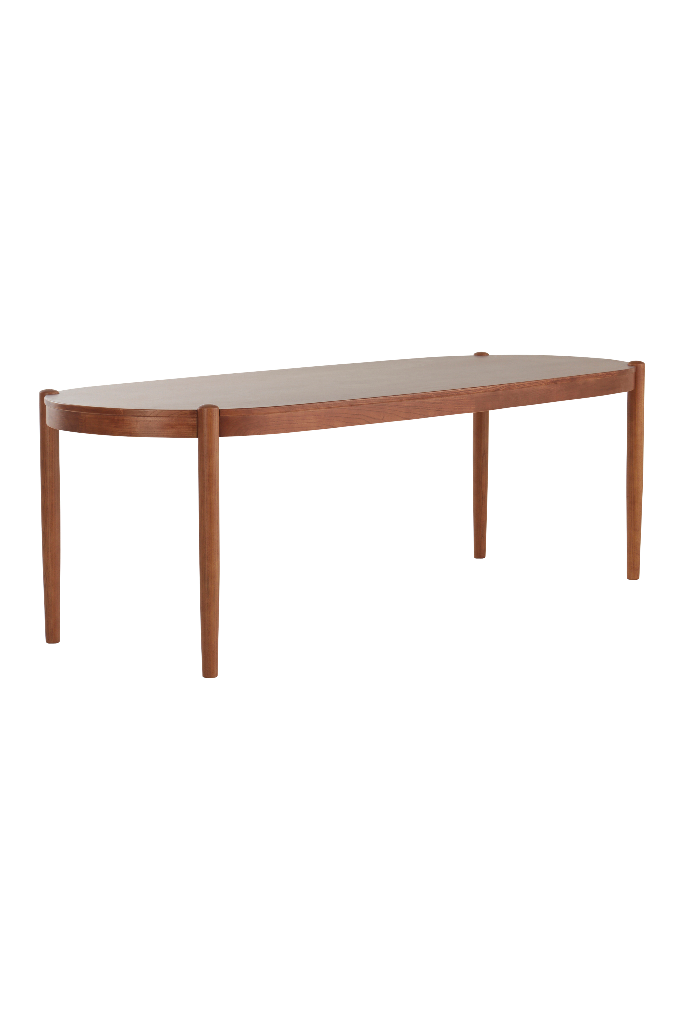 Ruokapöytä on valmistettu jalavapuusta ja pöytälevyn päällä on jalavaviilua. Ruokapöytä on muodoltaan soikea, ja pöydän ulkoreunaan sijoitetut ja samalla pöytälevyyn upotetut jalat antavat pöydälle hienon luonteen. Jalkojen sijoittelun ansiosta pöydän ääressä on helppo istua monelle. Pöytää on saatavana useilla erilaisilla, kauniilla viimeistelyillä, valitse kotiisi parhaiten sopiva väri.