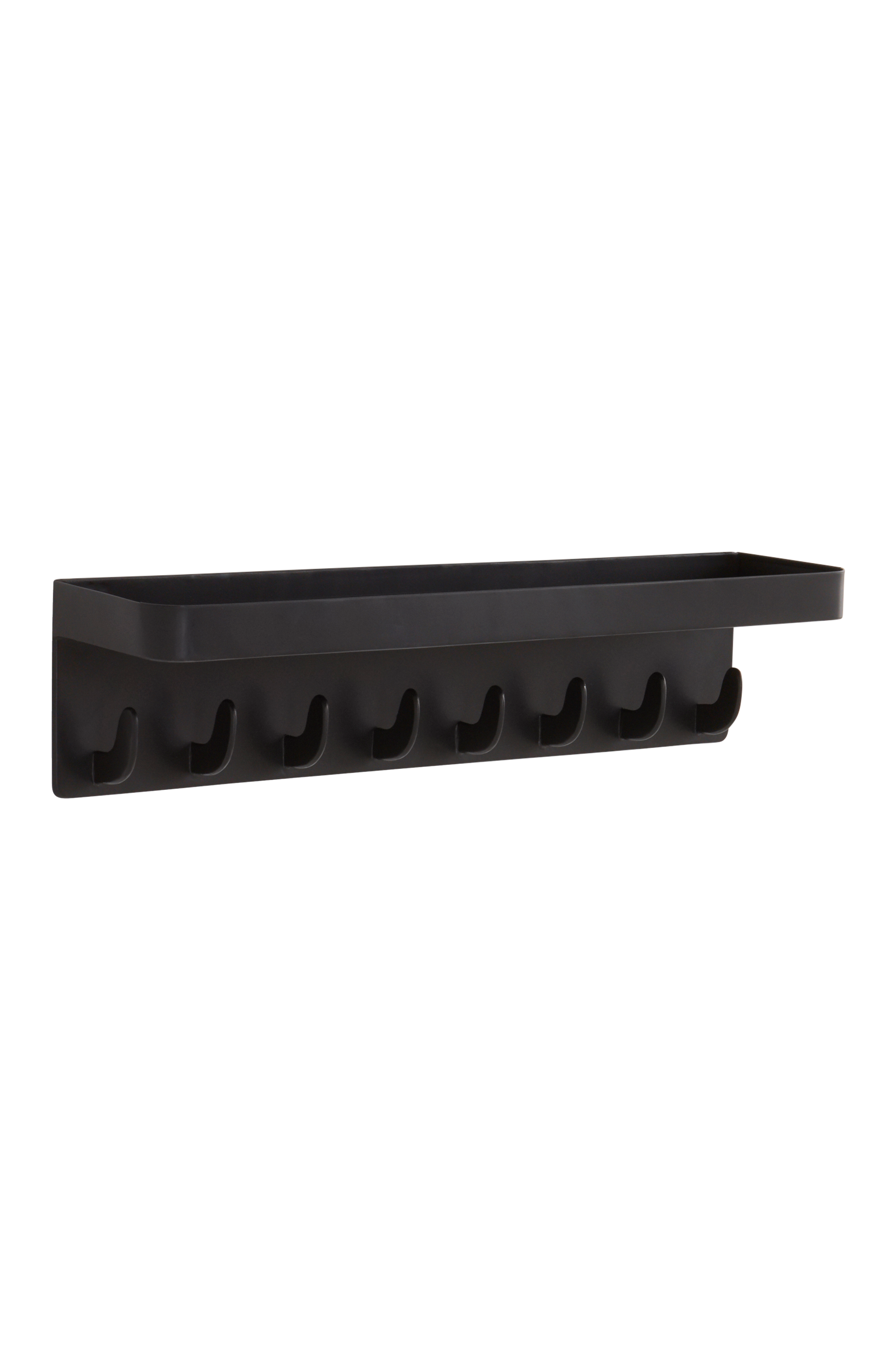 Naulakko rautaa, kahdeksan ripustuskoukkua käytännöllisen hyllyn alapuolella. Ripustuskoukut on muotoiltu käytännöllisesti siten, että vaatteet ja laukut eivät pääse liukumaan. Hyllyssä on pieni reuna, jotta esimerkiksi avaimet, matkapuhelimet ja muut pikkutavarat pysyvät paikallaan. Koko naulakko on maalattu mustaksi.
