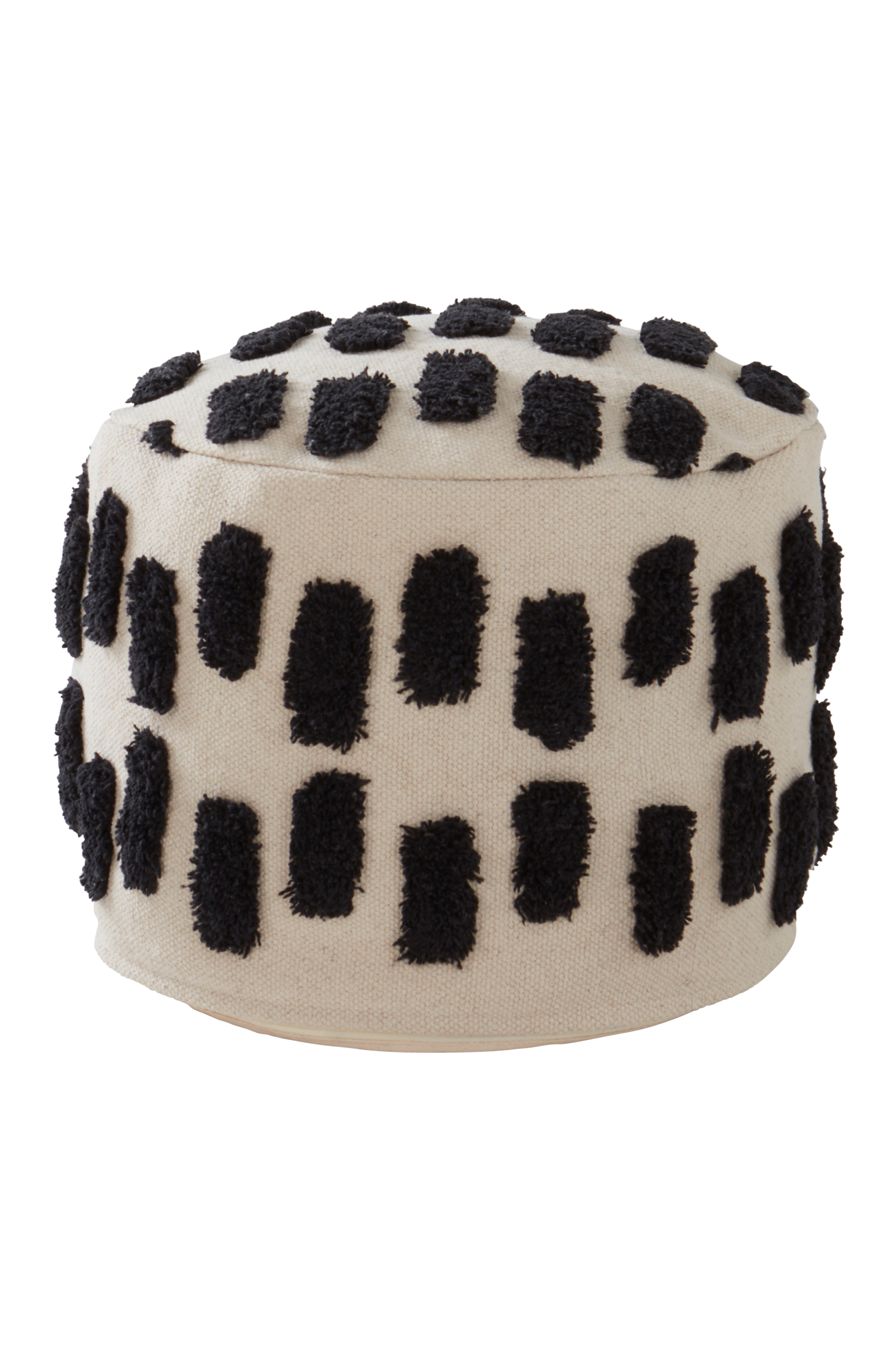 Pyöreä rahi napakkaa kangasta, jossa tuftattu kuvio. Nukka muodostaa neliöitä pellavanväriselle pohjalle. Rahissa on sisätyyny, jossa on pehmeä täyte styroksipalloista, jotka muotoutuvat mukavasti rahin päällä istuttaessa. Alareunassa vetoketju päällisen irrottamiseksi. Nukan pituus 1 cm.