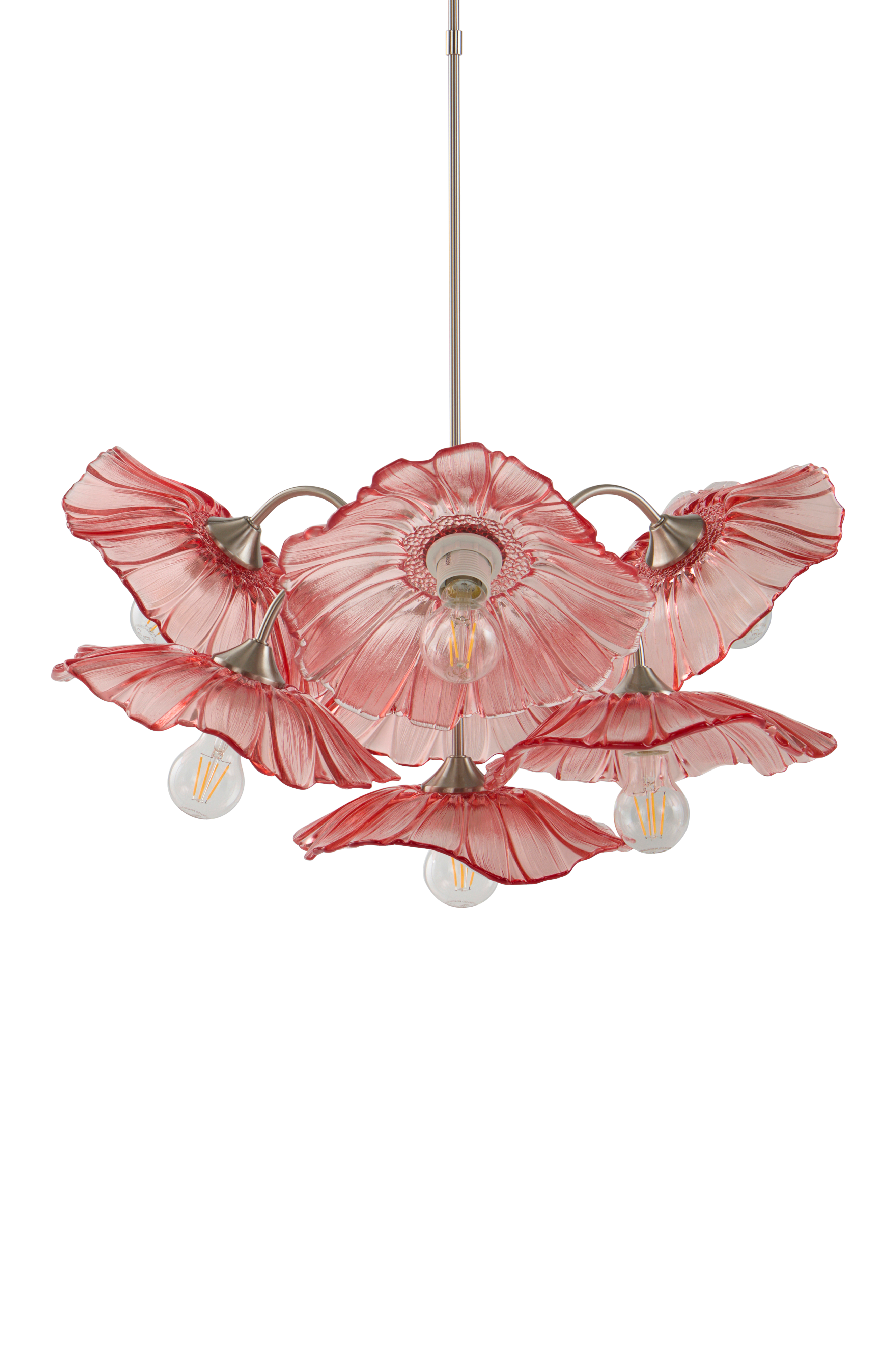 NUGGET-kruunu on modernin sisustuksen kiehtova keskipiste, jossa on tyylikäs metallijalusta ja seitsemän kukanmuotoista lasista valovarjostinta. Se tuo taiteellista valaistusta ja viehätystä ja täydentää yhteensopivia esineitä yhtenäisen ja tyylikkään sisustuksen luomiseksi.