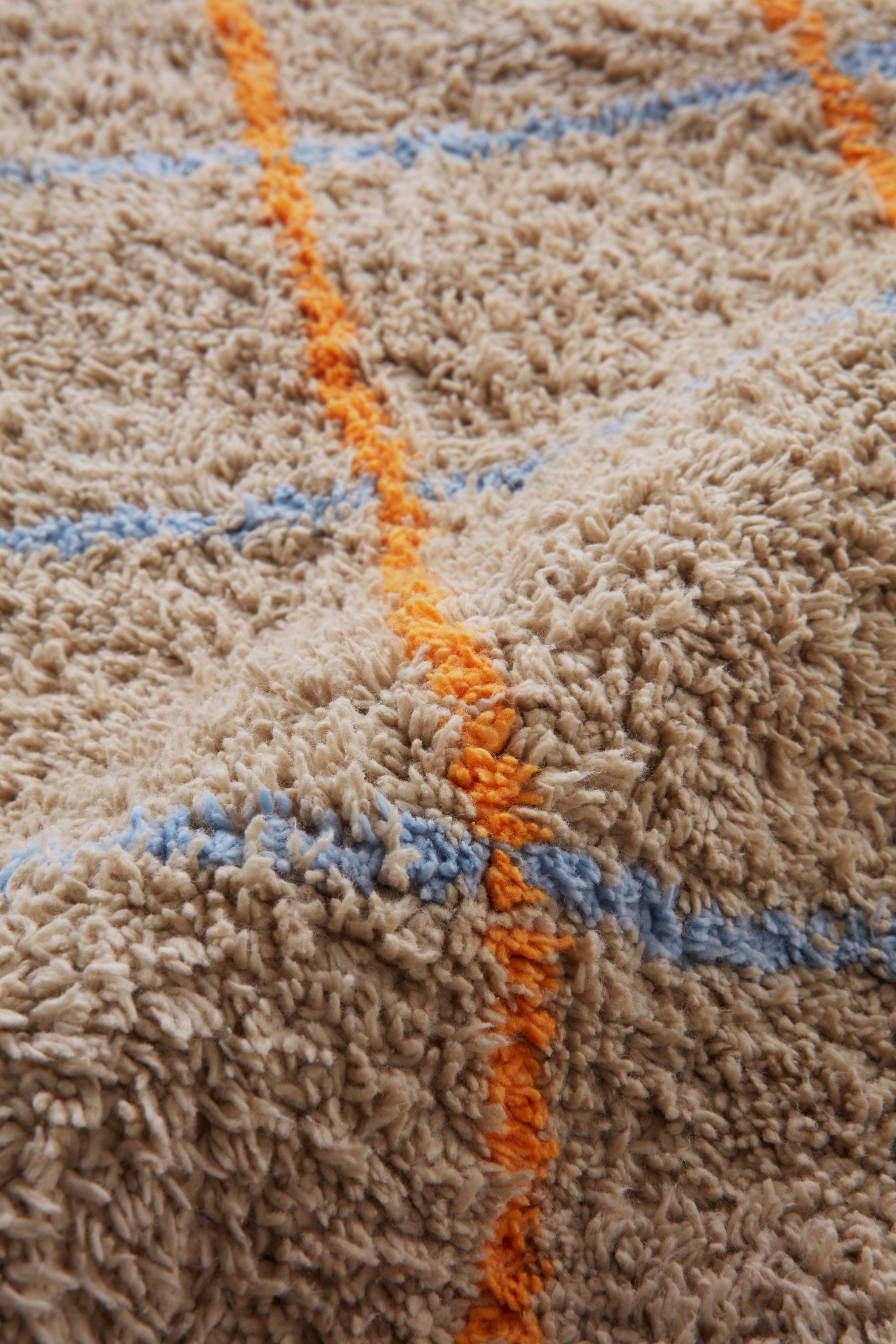 Pyöreä kuviollinen matto puuvillaa. Lyhyt, pehmeä nukka. Ruutukuvio on luotu ohuilla viivoilla nukkaan, yksi väri vaakasuuntaan ja toinen väri pystysuuntaan. Pehmeä ja miellyttävä puuvillamatto sopii sekä olohuoneeseen että makuuhuoneeseen. Nukan pituus 1 cm. Paksuus 1,1 cm. 1500 g/m².