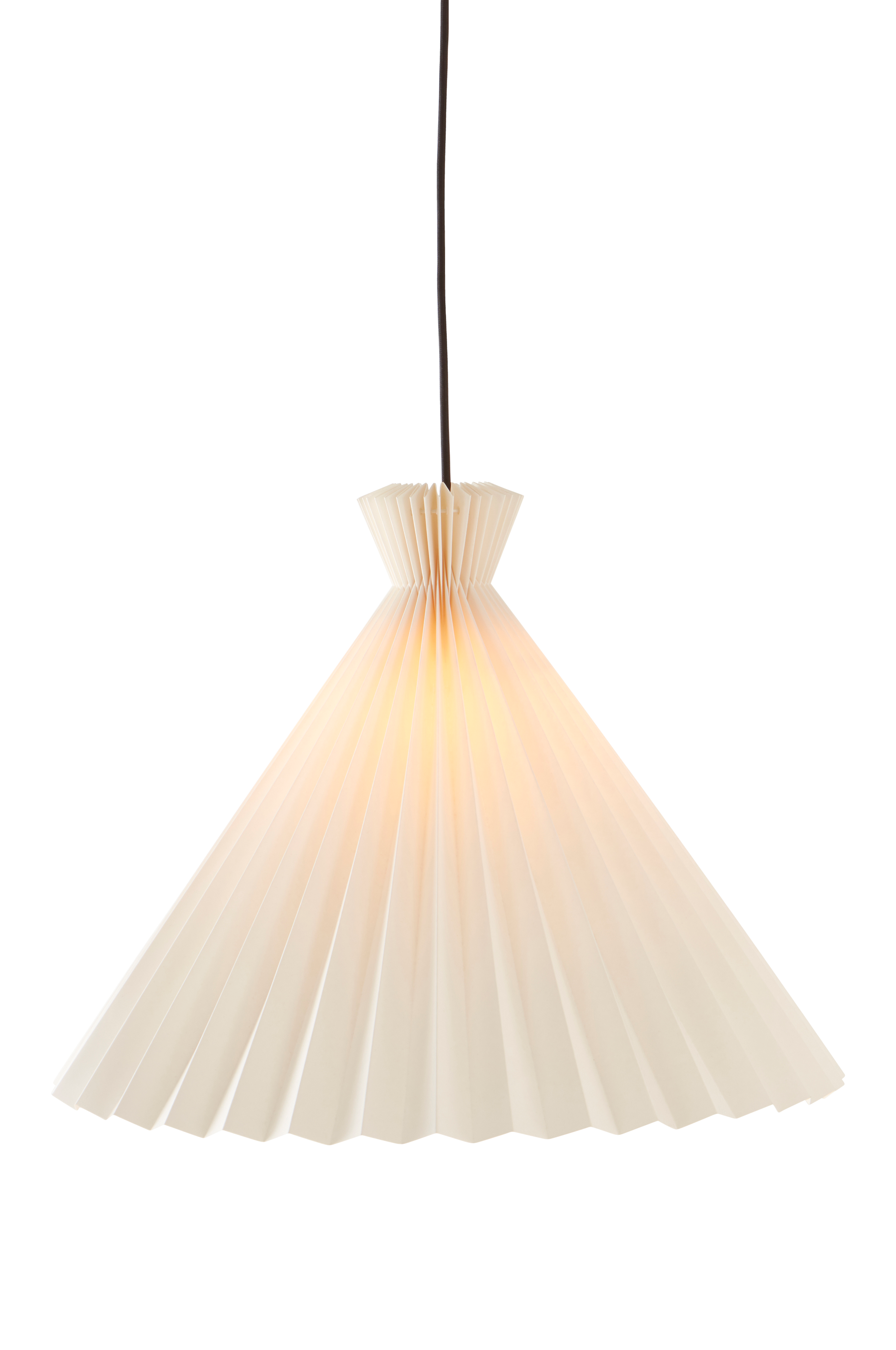 Kattovalaisin, jossa laskostettu paperivarjostin ja musta kangasjohto. Metallinen kattokuppi. Valaisin on maadoittamaton, luokka 2. EU-sääntöjen vuoksi tietyissä maissa vaaditaan erillinen kattopistoke. Kattopistokkeen tulee olla maadoittamaton (luokka 2), ja se ostetaan erikseen.
